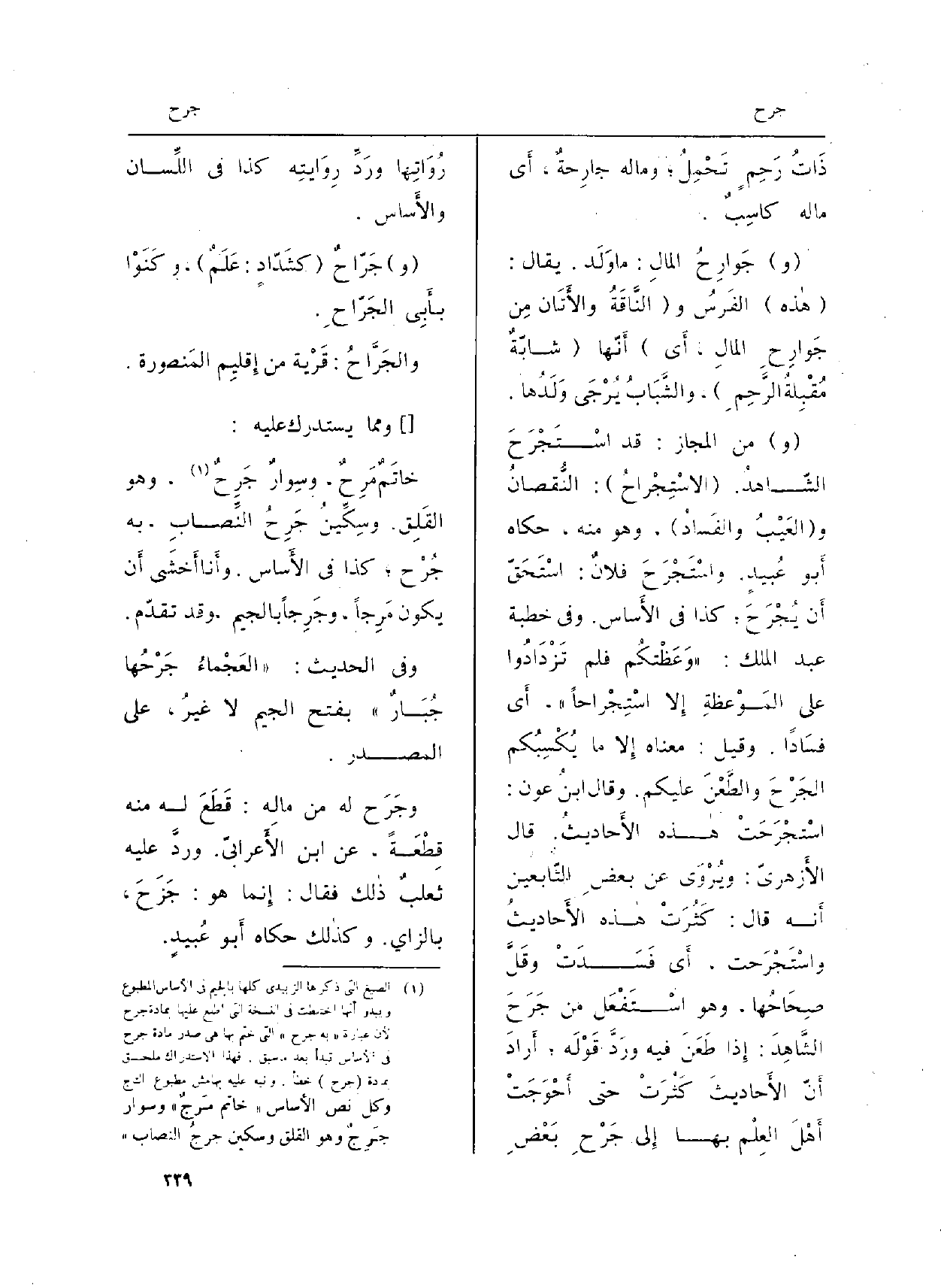(و) من الْمجَاز: قد اسْتَجْرَحَ الشّاهدُ. (الاسْتِجْراحُ) : النُّقصانُ و (العَيْبُ والفَسادُ) ، وَهُوَ مِنْهُ، حَكَاهُ أَبو عُبيدِ. واسْتَجْرَحَ فلانٌ: اسْتَحَقّ أَن يُجْرَحَ؛ كَذَا فِي (الأَساس) . وَفِي خطْبَة عبد الْملك: (وَعَظْتكُم فَلم تَزْدَادُوا على المَوْعظةِ إِلا اسْتِجْراحاً) ، أَي فسَاداً. وَقيل: مَعْنَاهُ إِلا مَا يُكْسِبُكم الجَرْحَ والطَّعْنَ عَلَيْكُم. وَقَالَ ابنُ عون: اسْتجْرَحَتْ هاذه الأَحاديثُ. قَالَ الأَزهريّ: ويُرْوَى عَن بعضِ التّابعين أَنه قَالَ: كَثُرَتْ هاذه الأَحاديثِ واسْتَجْرَحت، أَي فَسَدَتْ وقَلَّ صِحَاحُها، وَهُوَ اسْتَفْعَل من جَرَحَ الشَّاهِدَ: إِذا طَعَنَ فِيهِ ورَدَّ قَوْلَه؛ أَرادَ أَنّ الأَحاديثَ كَثُرَتْ حَتَّى أَحْوَجَتْ أَهْلَ العِلْم بهَا إِلى جَرْحِ بَعْضِ رُوَاتِها ورَدِّ رِوَايَتِه كَذَا فِي (اللِّسان) و (الأَساس) .
