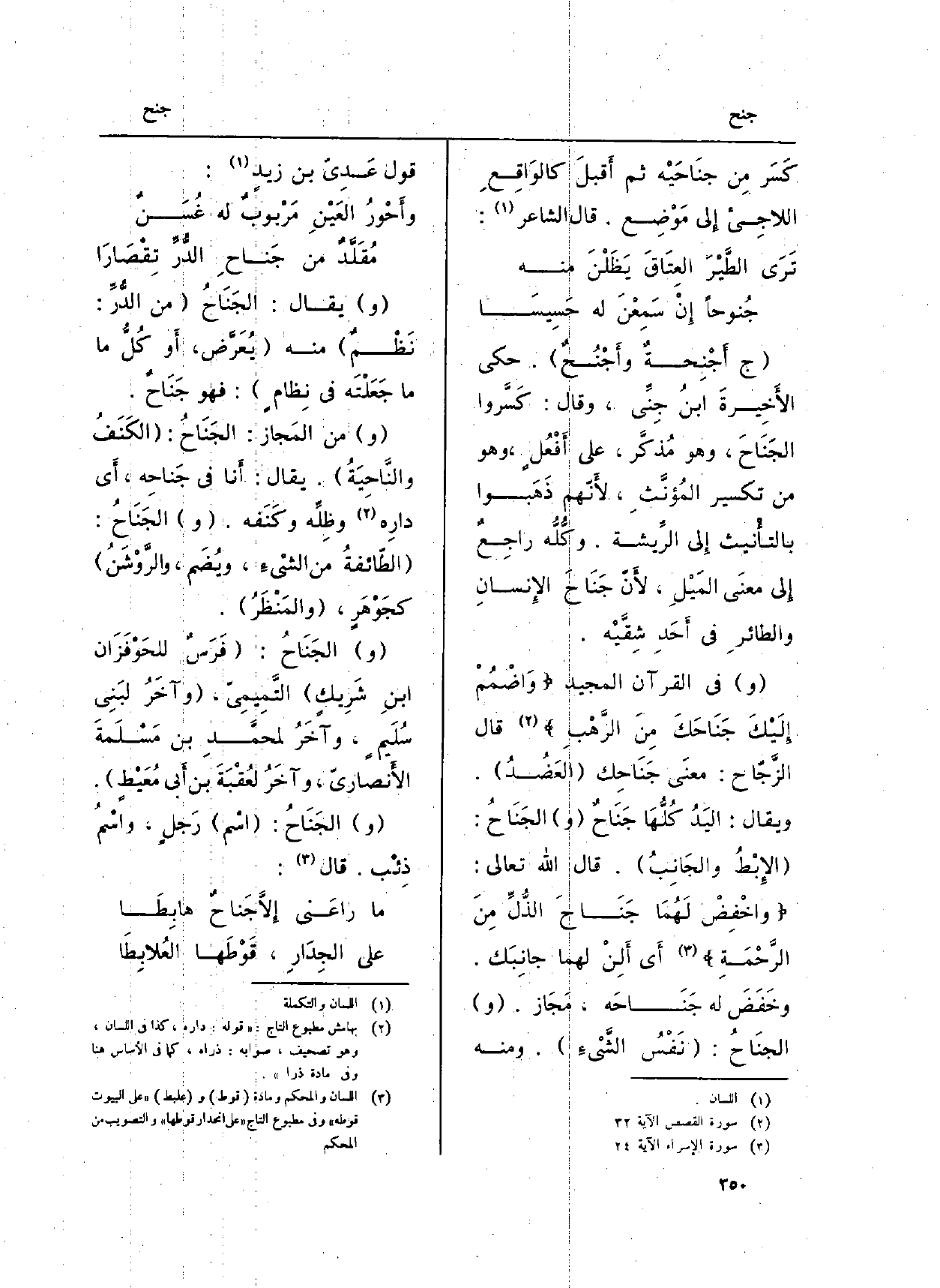 (و) فِي الْقُرْآن الْمجِيد {6. 019 واضمم اليك جناحك من الرهب} (الْقَصَص: 32) قَالَ الزَّجّاح: معنَى جَنَاحِك (العَضُدُ) . وَيُقَال: اليَدُ كُلُّهَا جَنَاحٌ (و) الجَنَاحُ: (الإِبْطُ والجَانِبُ) . قَالَ الله تَعَالَى: {وَاخْفِضْ لَهُمَا جَنَاحَ الذُّلّ مِنَ الرَّحْمَةِ} (الإِسراء: 24) أَي أَلِنْ لَهما جانِبَك. وخَفَضَ لَهُ جَنَاحَه، مَجَازِ. (و) الجنَاحُ: (نَفْسُ الشَّيْءِ) . وَمِنْه قَول عَدِيّ بن زيد: