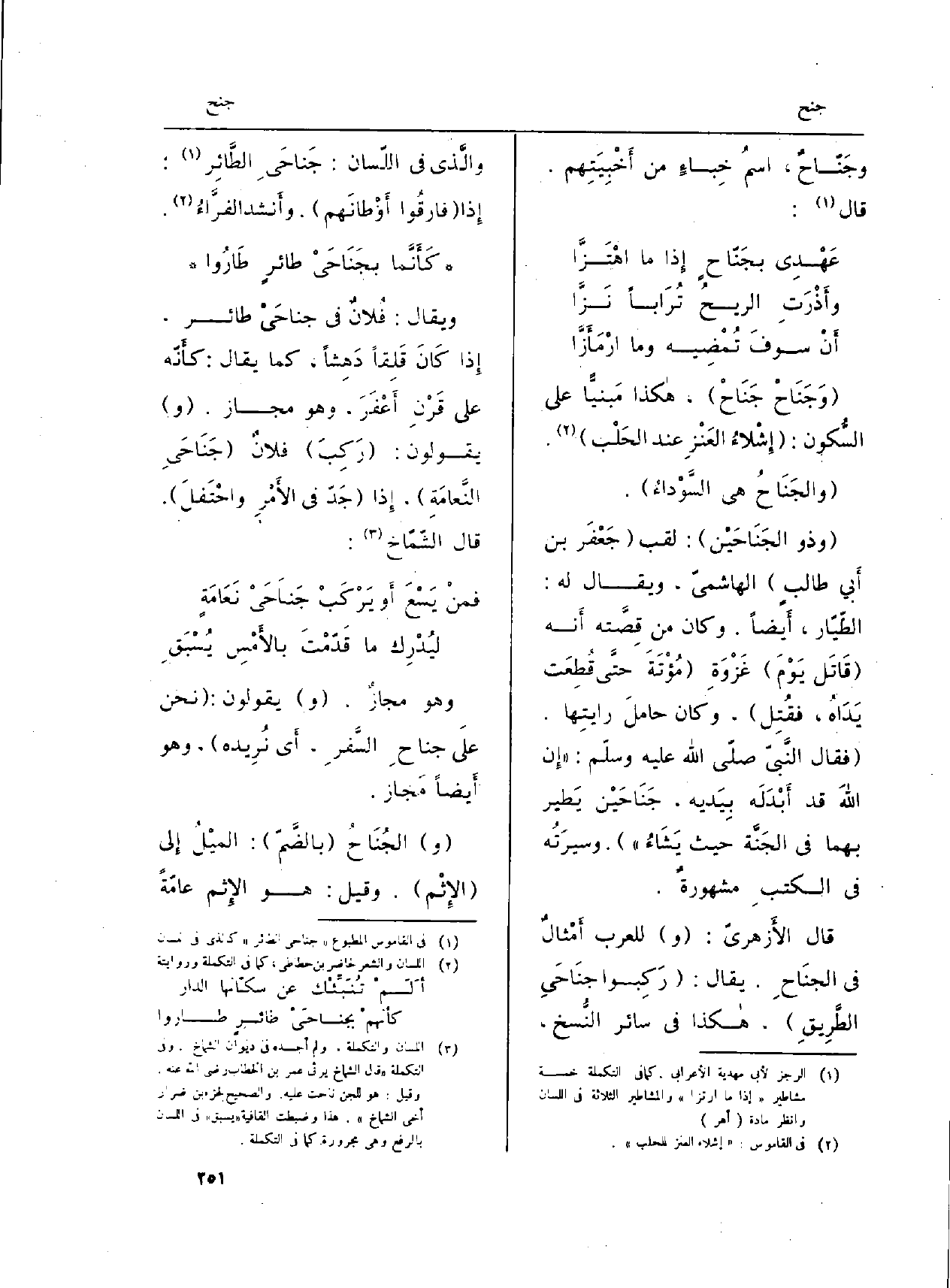 (و) الجُنَاحُ (بالضّمَّ) : الميْلُ إِلى (الإِثْم) . وَقيل: هُوَ الإِثم عامّةً
