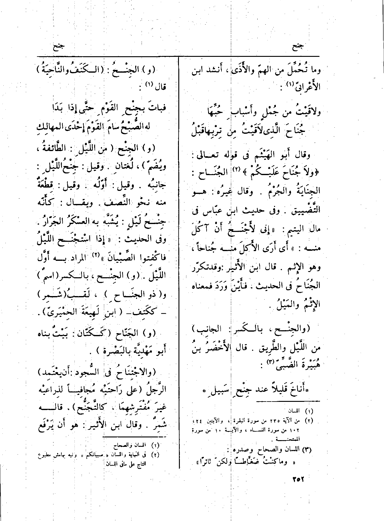 وَقَالَ أَبو الهَيْثَم فِي قَوْله تَعَالَى: {وَلاَ جُنَاحَ عَلَيْكُمْ} (الْبَقَرَة: 235) الجُنَاح: الجِنَايَةُ والجُرْمُ. وَقَالَ غيرُه: هُوَ التَّضييق. وَفِي حَدِيث ابْن عبّاس فِي مَال الْيَتِيم: (إِني لأَجْنَحُ أَنْ آكُلٍ مِنْهُ) : (أَي أَرَى الأَكلَ مِنْهُ جُناحاً، وَهُوَ الإِثم. قَالَ ابْن الأَثير: وَقد تكرّر الجُنَاحُ فِي الحَدِيث، فأَيْنَ وَرَدَ فَمَعْنَاه الإِثْمُ والمَيْلُ.