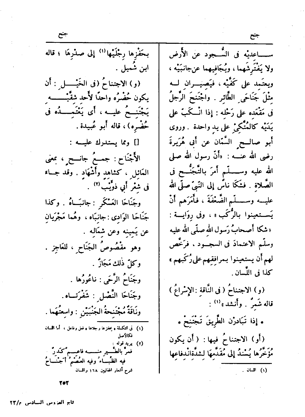 ساعِديْه فِي السُّجود عَن الأَرض وَلَا يَفْتَرِشَهما، ويُجافِيهما عَن جانبيَح، ويعتَمِد على كَفَّيْه، فيَصِيرانِ لَهُ مِثْلَ جَنَاحَي الطائِر. واجْتَنحَ الرَّجلُ فِي مَقْعَدِه على رَحْلِه: إِذا انْكَبّ على يَدَيْه كالمُتَّكِىءِ على يدٍ وَاحِدَة. وروى أَبو صالحٍ السَّمّان عَن أَبي هُرَيْرَة رَضِي الله عَنهُ: (أَنّ رَسُول الله صلى الله عَلَيْهِ وسلمأَمرَ بالتَّجنُّح فِي الصَّلاةِ. فشَكَا ناسٌ إِلى النّبيّ صلى الله عَلَيْهِ وسلمالضَّعْفَةَ، فأَمَرَهم أَن يَستعينوا بالرُّكَب) ، وَفِي رِوَاية: (شكا أَصحابُ رَسول اللَّهِ صلى الله عَلَيْهِ وسلمالاعتمادَ فِي السُّجُود، فرَخَّص لَهُم أَن يستعينوا بمرافِقِهم على رُكَبهم) كَذَا فِي (اللَّسان) .