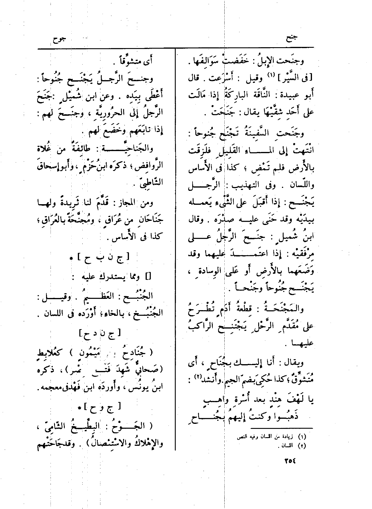 وجنحَ الرَّجلُ يَجْنَح جُنُوحاً: أَعْطَى بِيَدِه. وَعَن ابْن شُميْلٍ: جَنَحَ الرَّجلُ إِلى الحرُورِيَّةِ، وجنَحَ لَهُم: إِذا تابَعَهم وخَضَعَ لَهُم.
