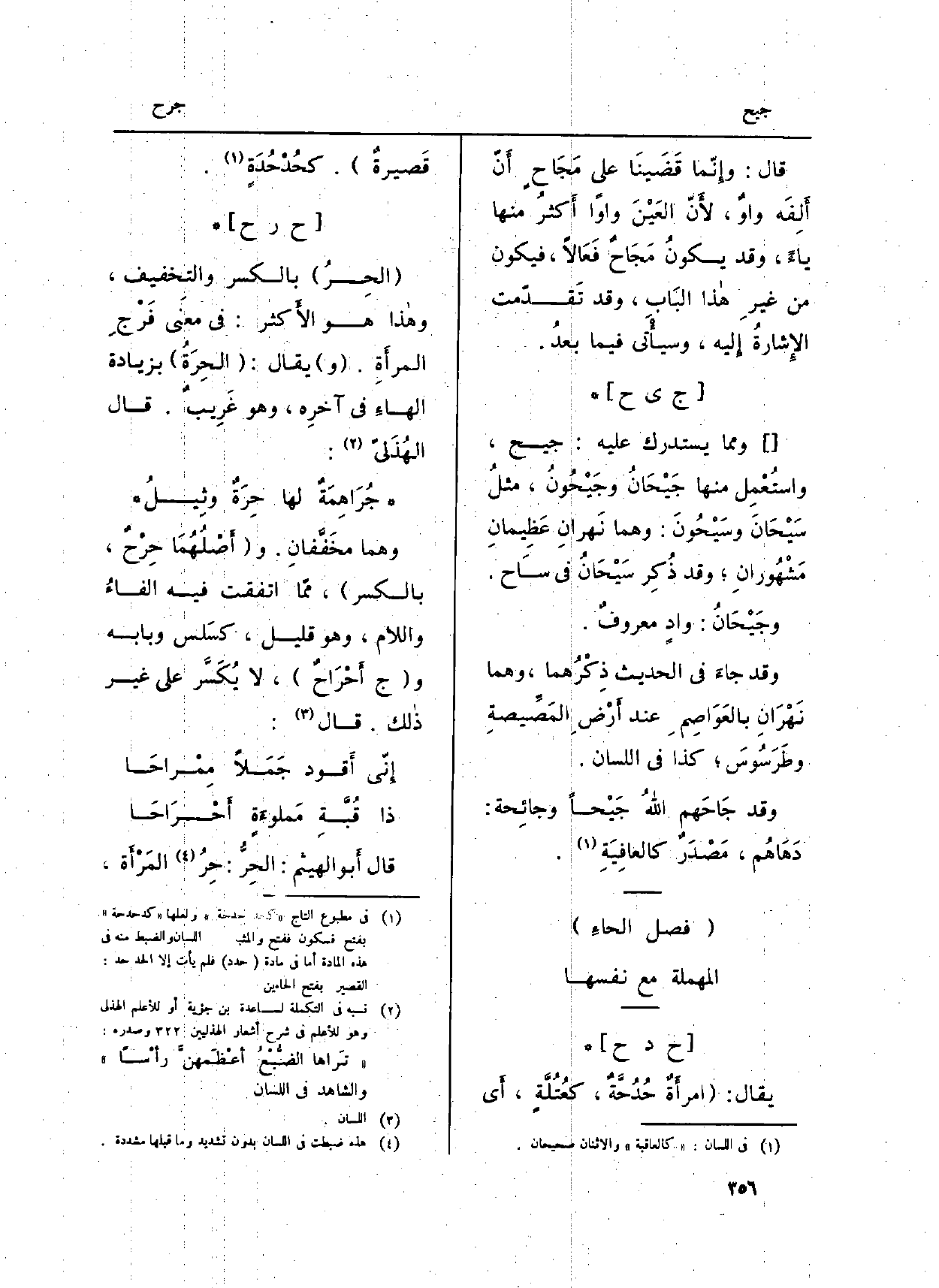 جيح: وَمِمَّا يسْتَدرك عَلَيْهِ: {جيح، واستُعْمِل مها} جَيْحَانُ {وجَيْحُونُ، مثلُ سَيْحَانَ وسَيْحُونَ: وهما نهرانِ عَظِيمَانِ مَشْهُورانِ؛ وَقد ذِكِر سَيْحَانُ فِي سَاح.