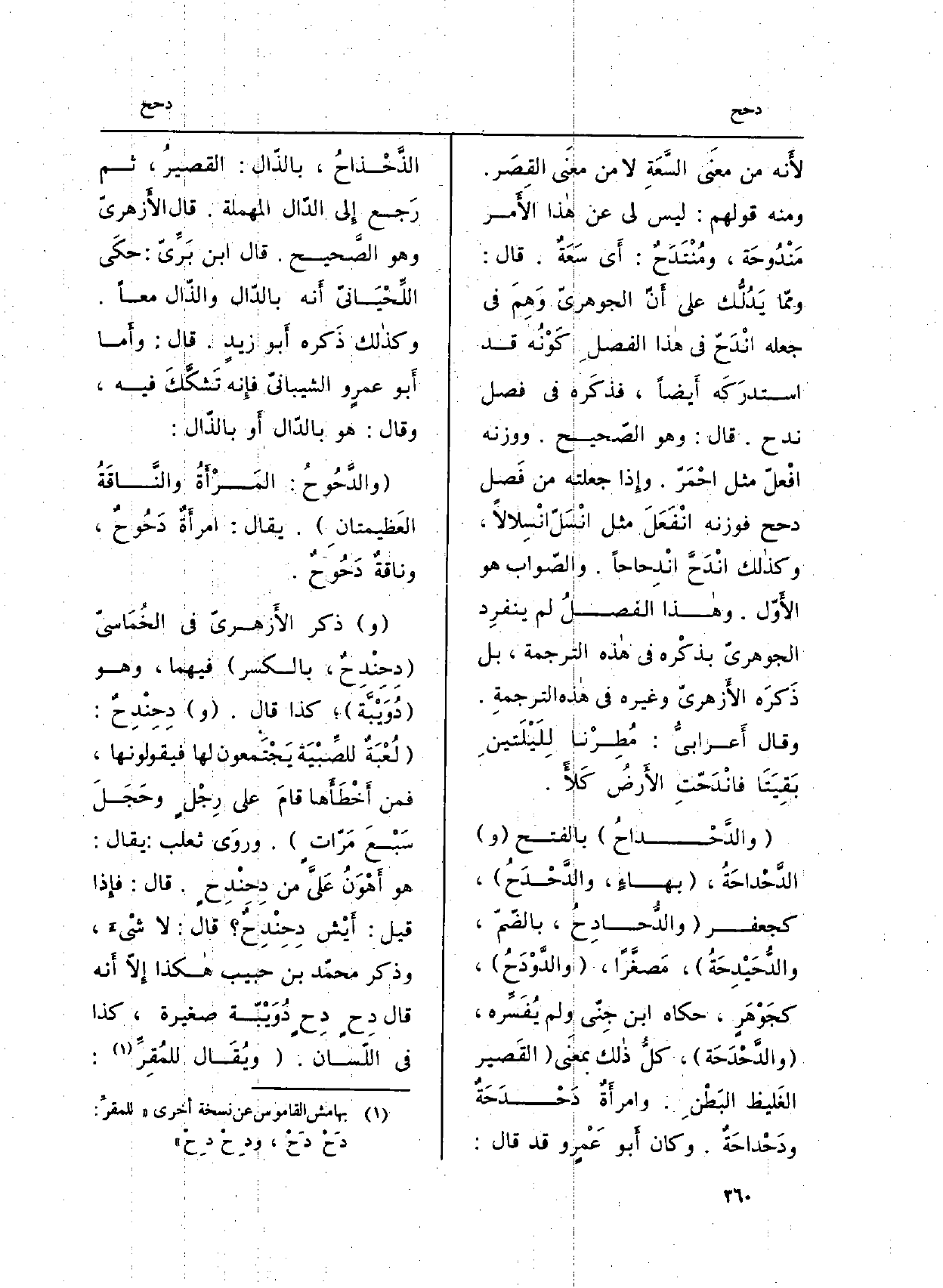 لأَنه من معنَى السَّعَةِ لَا من معنَى القِصَر. وَمِنْه قَوْلهم: لَيْسَ لي عَن هاذا الأَمر {مَنْدُوحَة،} ومُنْتَدَحٌ: أَي سَعَةٌ. قَالَ: وممّا يَدُلُّك على أَنّ الجوهريّ وَهِمع فِي جعله انْدَحّ فِي هاذا الفصلِ كَوْنُ قد استدرَكَه أَيضاً، فذكَره فِي فصل ندح. قَالَ: وَهُوَ الصّحيح. ووزنه افْعلّ مثل احْمَرّ. وإِذا جعلته من فَصل دحح فوزنه انْفَعَلَ مثل انْسَلّ انْسِلالاً، وكذالك {انْدَحَّ} نْدِحاحاً. والصّواب هُوَ الأَوّل. وهاذا الفصلُ لم ينفرِد الجوهريّ بذكْره فِي هاذه التَّرْجَمَة، بل ذَكرَه الأَزهريّ وَغَيره فِي هاذه الترجمةِ. وَقَالَ أَعرابيُّ: مُطِرْنا لِلَيْلَتينِ بَقِيَتَا فانْدَحّتِ الأَرضُ كَلأً.