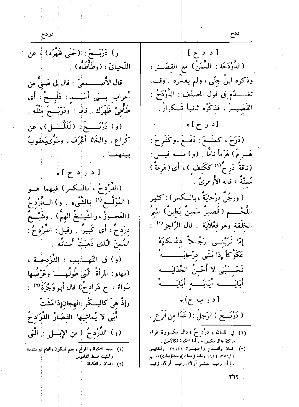 (و) فِي (التَّهْذِيب) : الدِّرْدِحة، (بهاءٍ: المرأَةُ الّتي طُولُها وعَرْضُها سَواءٌ، ج دَرادِحُ) قَالَ أَبو وَجْزَةَ: