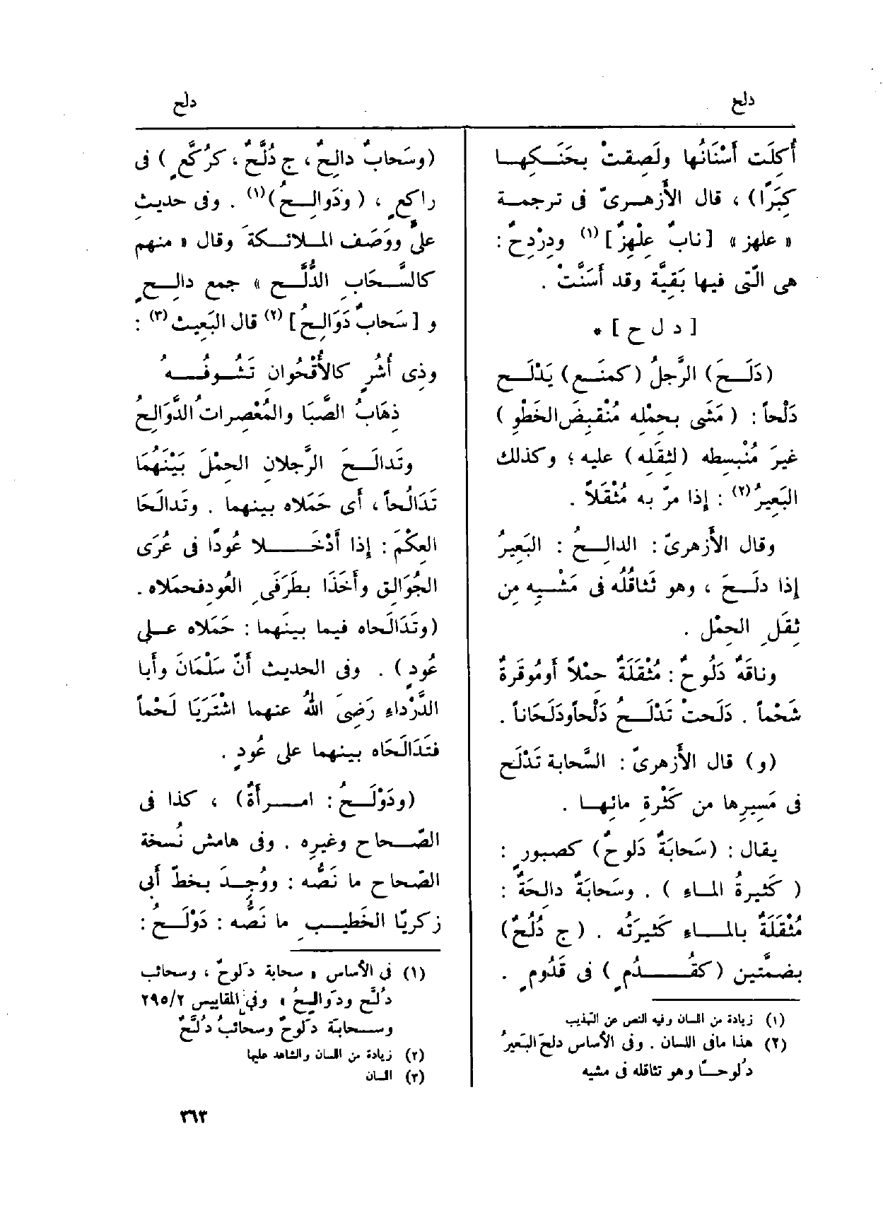 يُقَال: (سَحابَةٌ دَلوحٌ) كصبورٍ: (كَثيرةُ الماءِ) . . وسَحابَةٌ دالِحَةٌ: مُثْقَلَةٌ بالماءِ كَثيرَتُه. (ج دُلُحٌ) بضمَّتين (كقُدُمٍ) فِي قَدُومٍ.