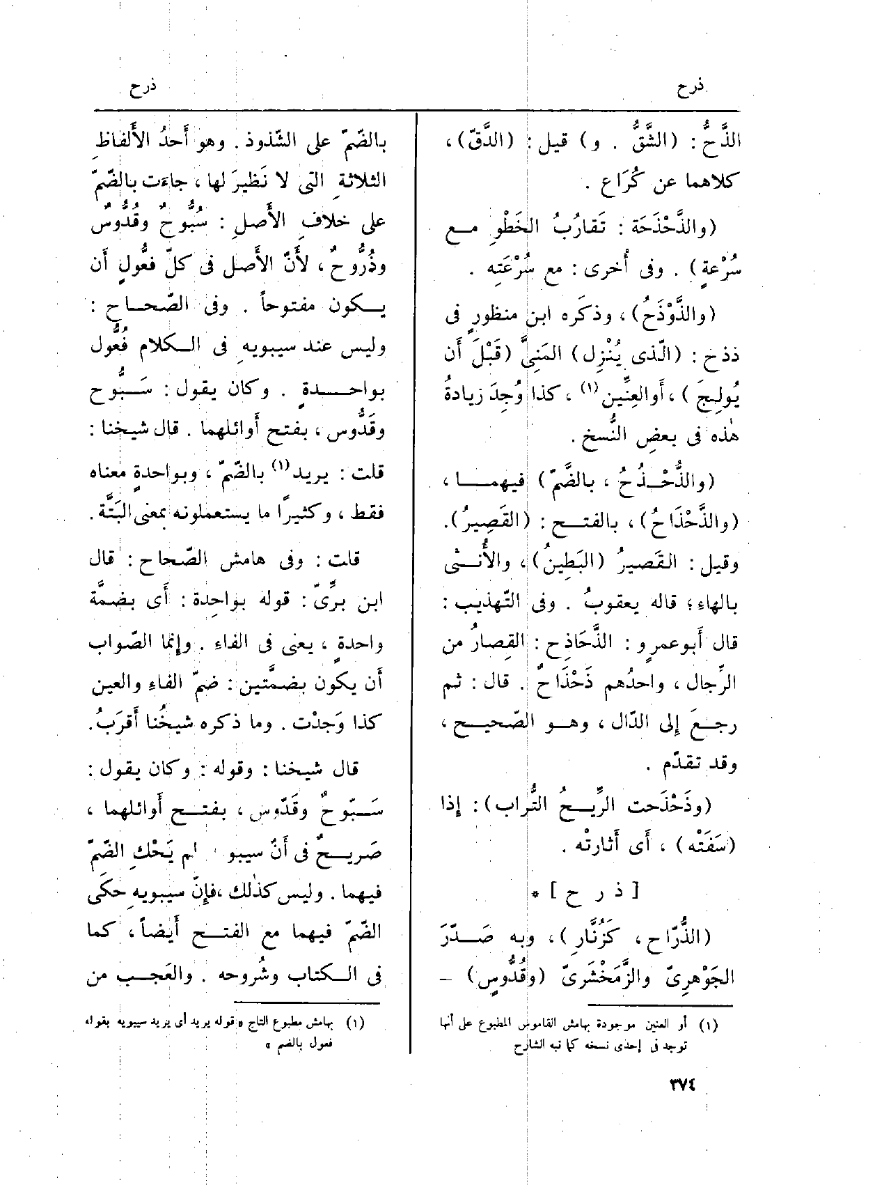 : (الذُّرّاح، كَزُنَّارِ) ، وَبِه صَدّرَ الجَوْهرِيّ والزَّمَخْشَريّ (وقُدُّوسٍ) بالضّمّ على الشّذوذ. وَهُوَ أَحدُ الأَلفاظِ الثلاثةِ الَّتِي لَا نَظيرَ لَهَا، جاءَت بالضّمّ على خلافِ الأَصلِ: سُبُّوحٌ وقُدُّوسٌ وذُرُّوحٌ، لأَنّ الأَصل فِي كلّ فعُّولٍ أَن يكون مَفْتُوحًا. وَفِي (الصّحاح) : وَلَيْسَ عِنْد سيبويهِ فِي الْكَلَام فُعُّول بواحدةٍ. وَكَانَ يَقُول: سَبُّوح وقَدُّوس، بِفَتْح أَوائلهما. قَالَ شَيخنَا: قلت: يُرِيد بالضّمّ، وبواحدةٍ مَعْنَاهُ فَقَط، وَكَثِيرًا مَا يستعملونه بِمَعْنى البَتَّة.