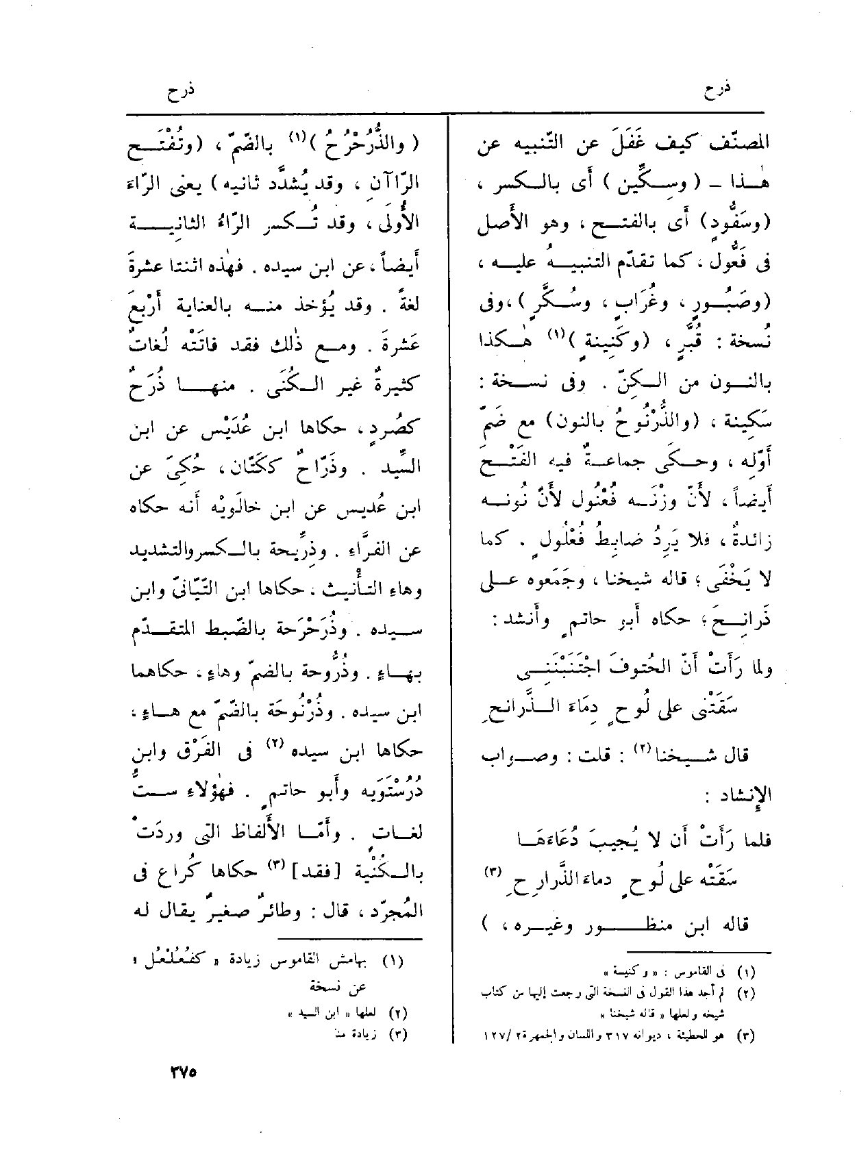 قَالَه ابْن مَنْظُور وَغَيره، (والذُّرُحْرُحُ) بالضّمّ، (وتُفْتَح الرّاآنِ، وَقد يُشدَّد ثَانِيه) يَعْنِي الرّاءَ الإِولَى، وَقد تُكسر الرّاءُ الثانِية أَيضاً، عَن ابْن سيهد. فهاذه اثْنَتَا عشرةَ لُغَة. وَقد يُؤخذ مِنْهُ بالعناية أَرْبعَ عشرةَ. وَمَعَ ذالك فقد فاتَتْه لُغاتٌ كثيرةٌ غير الكُنَى. مِنْهَا ذُرَحٌ كصُردٍ، حَكَاهَا ابْن عُدَيْس عَن ابْن السِّيد. وذَرّاحٌ ككَتّان، حُكِيَ عَن ابْن عُديس عَن ابْن خالَويْه أَنه حَكَاهُ عَن الفرَّاءِ. وذِرِّيحة بِالْكَسْرِ وَالتَّشْدِيد وهاءِ التأْنيث، حَكَاهَا ابْن التّيّانيّ وَابْن شيده. وذُرَحْرَحة بالضّبط المتقدّم بهاءٍ. وذُرُّوحة بالضمّ وهاءٍ، حَكَاهُمَا ابْن سَيّده. وذُرْنُوحَة بالضّمّ مَعَ هاءٍ. حَكَاهَا ابْن سَيّده فِي الفَرْق وَابْن دُرُسْتَوَيه وأَبو حاتمٍ. فهاؤلاءِ ستُّ لغاتٍ. وأَمّا الأَلفاظ الَّتِي وردَتْ بالكُنْية (فقد) حَكَاهَا كُراع فِي المُجرّد. قَالَ: وطائرٌ صغيرٌ يُقَال لَهُ