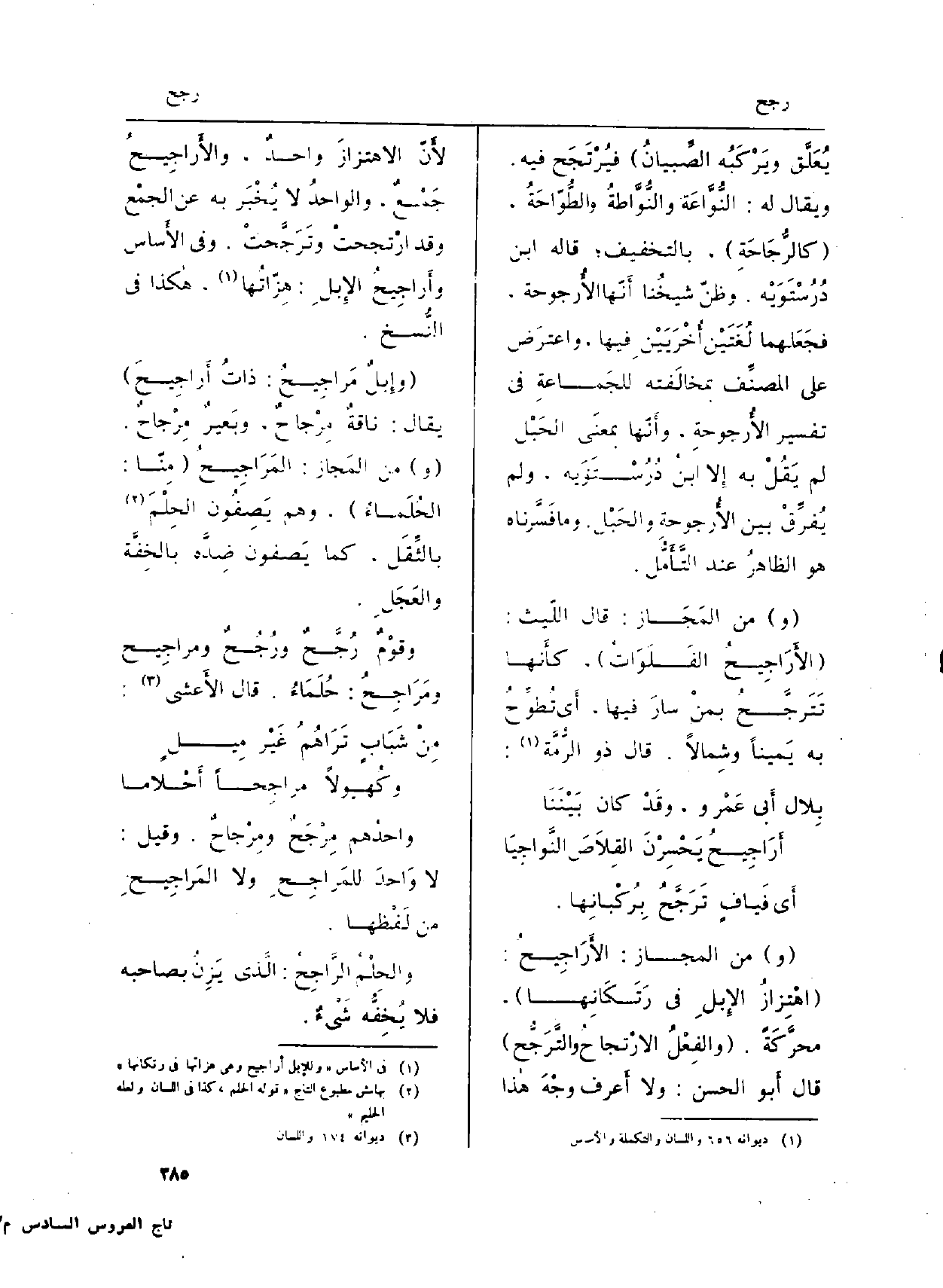 (و) من الْمجَاز: الأَرَاجِيحُ: (اهْتِزازُ الإِبلِ فِي رَتَكَانِها) ، محرَّكَةً. (والفِعْلُ الارْتجاحُ والتَّرَجُّح) قَالَ أَبو الْحسن: وَلَا أَعرف وجْهَ هاذا لأَنّ الاهتزازَ واحدٌ، والأَراجِيحُ جَمْعٌ، والواحدُ لَا يُخْبَر بِهِ عَن الجمْع وَقد ارْتَجحَتْ وتَرَجَّحتْ. وَفِي (الأَساس) وأَراجِيحُ الإِبلِ: هِزّاتُها، كَذَا فِي النُّسخ.