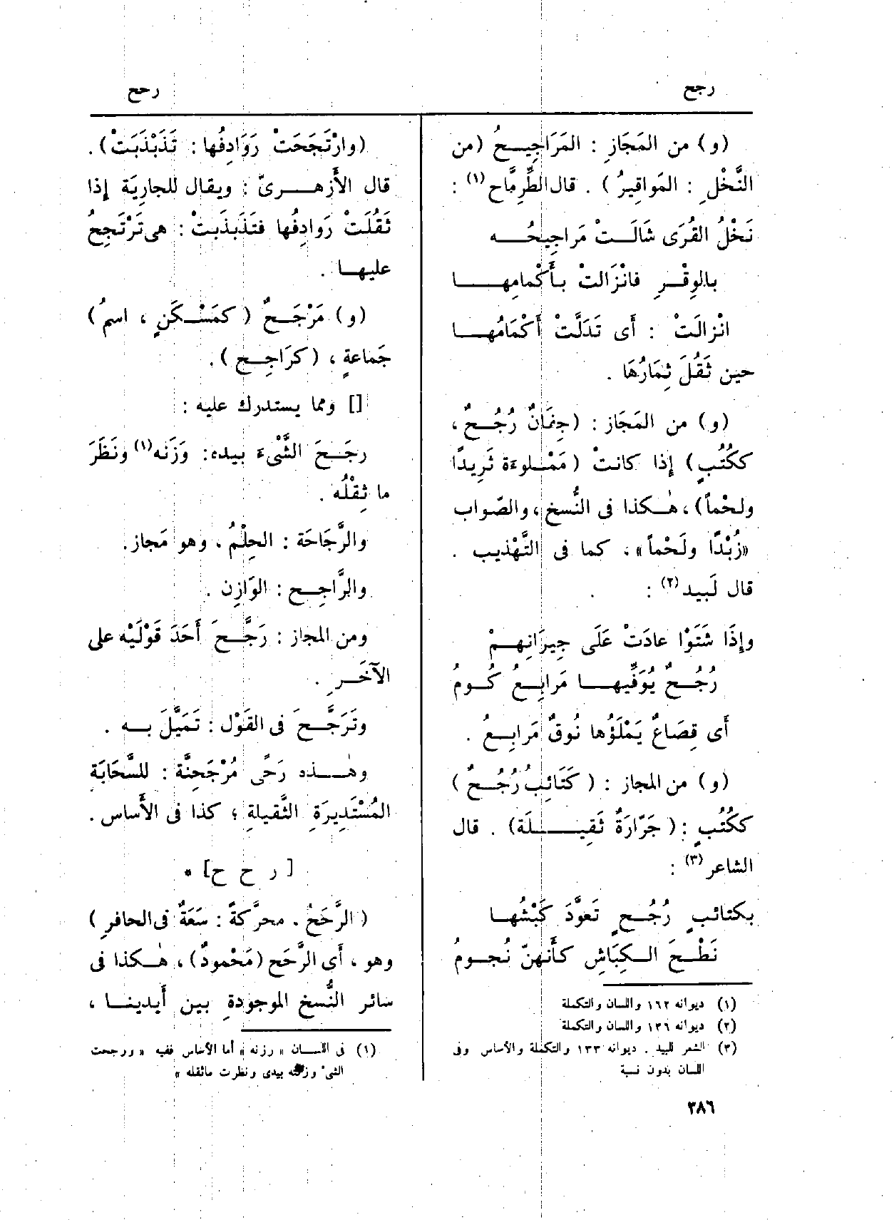 (و) من المَجَاز: (جِفَانٌ رُجُحٌ، ككُتُبٍ) إِذا كانتْ (مَمْلوءَة ثَرِيداً ولحْماً) ، هاكذا فِي النُّسخ، والصّواب (زُبْداً ولَحْماً) ، كَمَا فِي (التَّهْذيب) قَالَ لبيد: