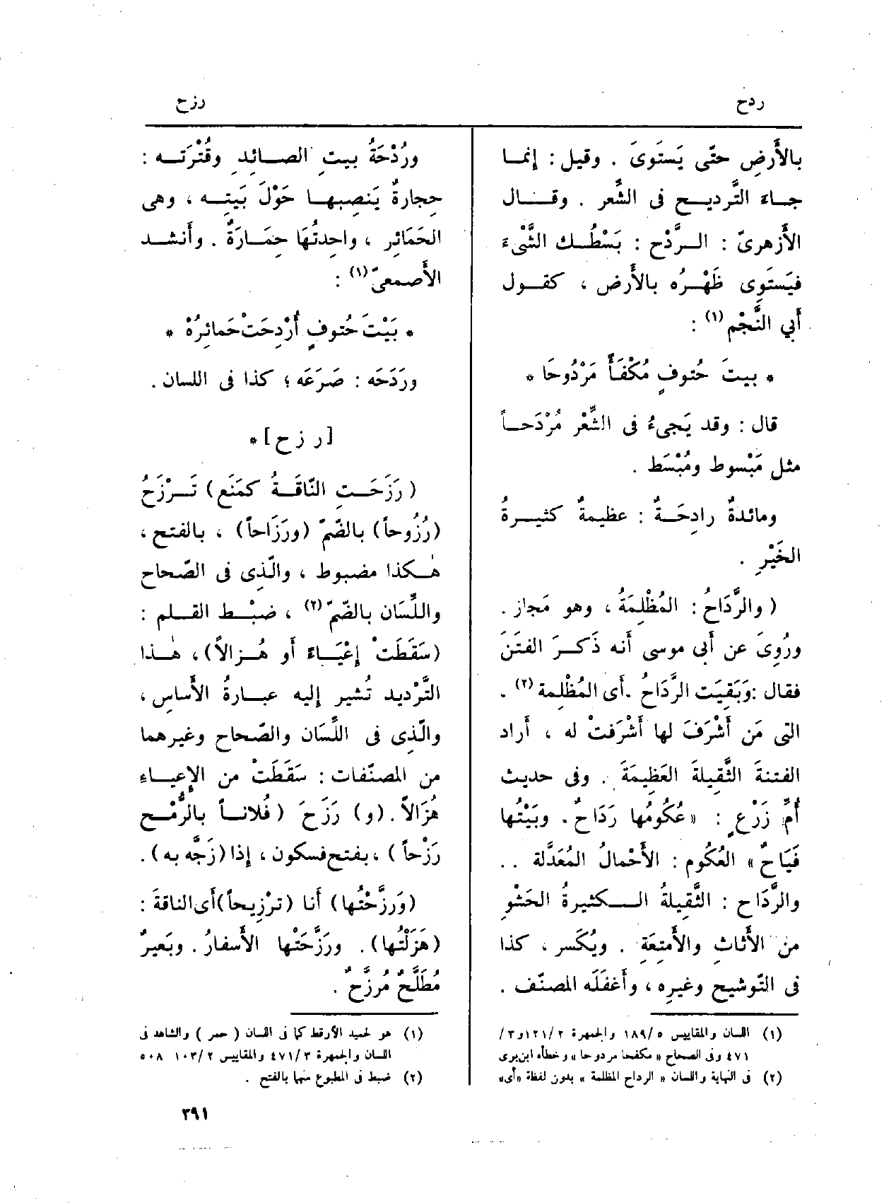 (والرَّدَاحُ: المُظْلِمَة، وَهُوَ مَجاز. ورُوِيَ عَن أَبي مُوسَى أَنه ذَكرَ الفتَنَ فَقَالَ: وبَقِيَت الرَّدَاحُ، أَي المُظْلِمة، الَّتِي مَن أَشْرَفَ لَهَا أَشْرَفتْ لَهُ، أَراد الفتنةَ الثَّقِيلَةَ العَظِيمَةَ. وَفِي حَدِيث أُمِّ زَرْعٍ: (عُكُومُها رَدَاحٌ، وبَيْتُها فَيَاحٌ) العُكُوم: الأَحمالُ المُعَدَّلة ... والرَّدَاح: الثَّقِيلةُ الكثيرةُ الحَشْوِ من الأَثاث والأَمتِعَةِ. ويُكَسر، كَذَا فِي التّوشيح وغيرِه، وأَغفَلَه المصنّف.