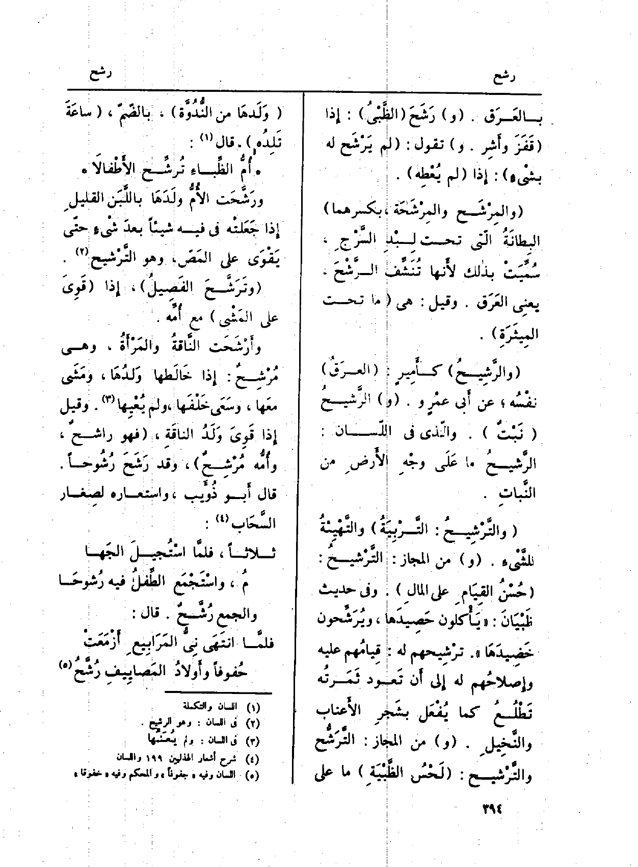 (والتَّرْشِيحُ: التَّرْبِيَةُ) والتَّهْيِئةُ للشَّيْءِ. (و) من الْمجَاز: التَّرْشيحُ: (حُسْنُ القِيَامِ على المالِ) . وَفِي حَدِيث ظَبْيَانَ: (يَأْكلون حَصِيدَها، ويُرَشِّحون خَضِيدهَا) . ترْشِيحهم لَهُ: قيامُهم عَلَيْهِ وإِصلاحُهم لَهُ إِلى أَن تَعود ثَمَرتُه تَطْلُعُ كَمَا يُفْعَل بشَجرِ الأَعناب والنَّخِيلِ. (و) من الْمجَاز: التَّرَشُّح والتَّرْشيح: (لَحْسُ الظَّبْيَةِ) مَا على (وَلَدها من النُّدُوَّة) ، بالضّمّ، (ساعةَ تَلِدُه) ، قَالَ: