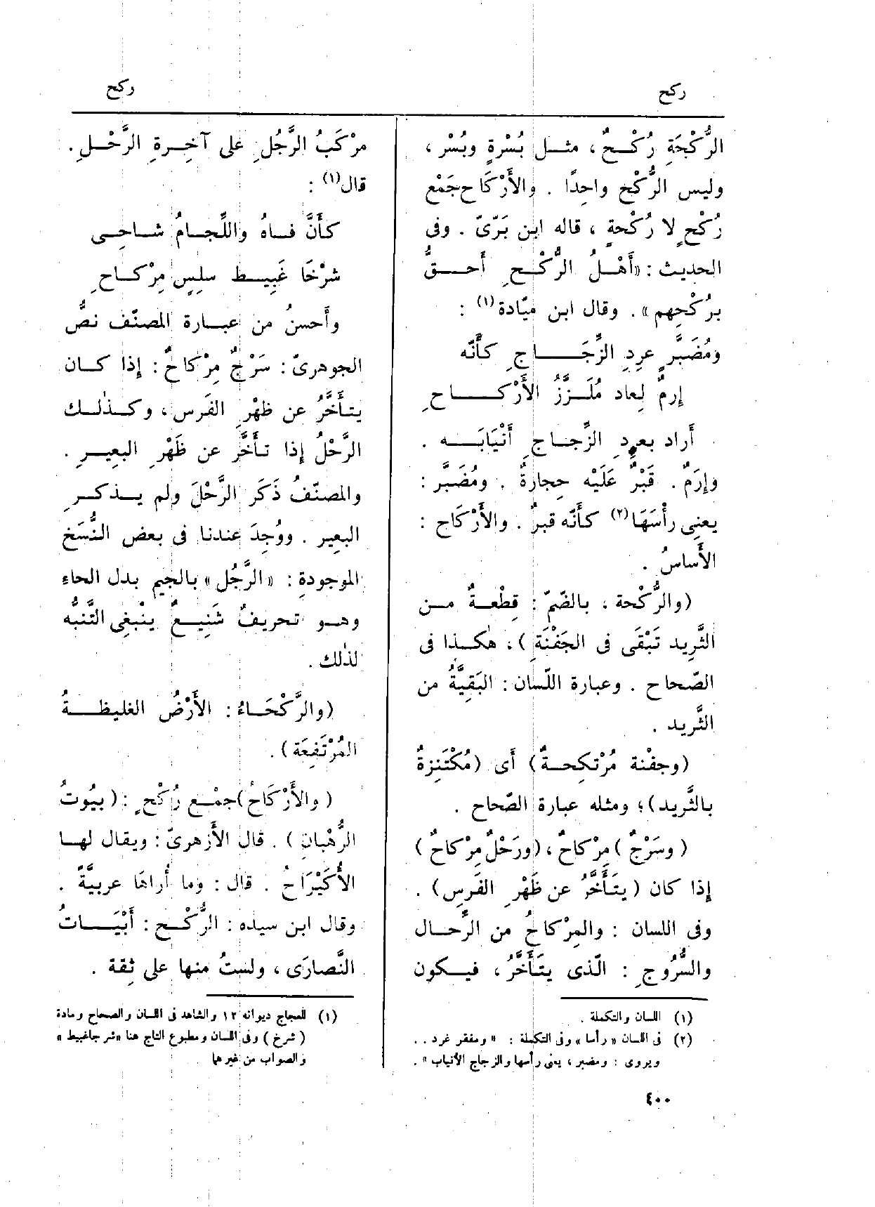 وأَحسنُ من عبارَة المصنّف نصُّ الجوهريّ: سَرْجٌ مِرْكاحٌ: إِذا كَانَ يتأَخَّرُ عَن ظهْرِ الفَرس، وكذالك الرَّحْلُ إِذا تأَخَّر عَن ظَهْرِ البعِيرِ. والمصنّفُ ذَكَرَ الرَّحْلَ وَلم يذكرِ البعِير. ووُجِدَ عندنَا فِي بعض النُّسَخ الموجودةِ: (الرَّجُل) بِالْجِيم بدل الحاءِ وَهُوَ تحريفٌ شَنيعٌ ينْبغِي التَّنَبُّه لذالك.