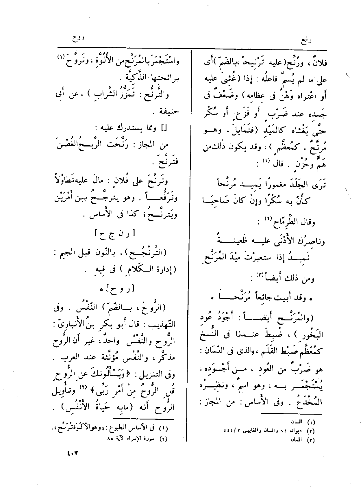 : (! الرُّوحُ، بالضّمّ) النّفْسُ. وَفِي (التَّهْذِيب) : قَالَ أَبو بكرِ بن الأَنبارُيّ: الرُّوح والنَّفْسُ واحدٌ، غير أَن الرُّوح مذكَّر، والنَّفْس مُؤنَّثة عِنْد الْعَرَب. وَفِي التَّنْزِيل: {6. 023 ويساءَلونك عَن الرّوح. . رَبِّي} (: الإِسراء 85) وتأْويل الرُّوح أَنه (مَا بِه حَياةُ الأَنْفُسِ) .