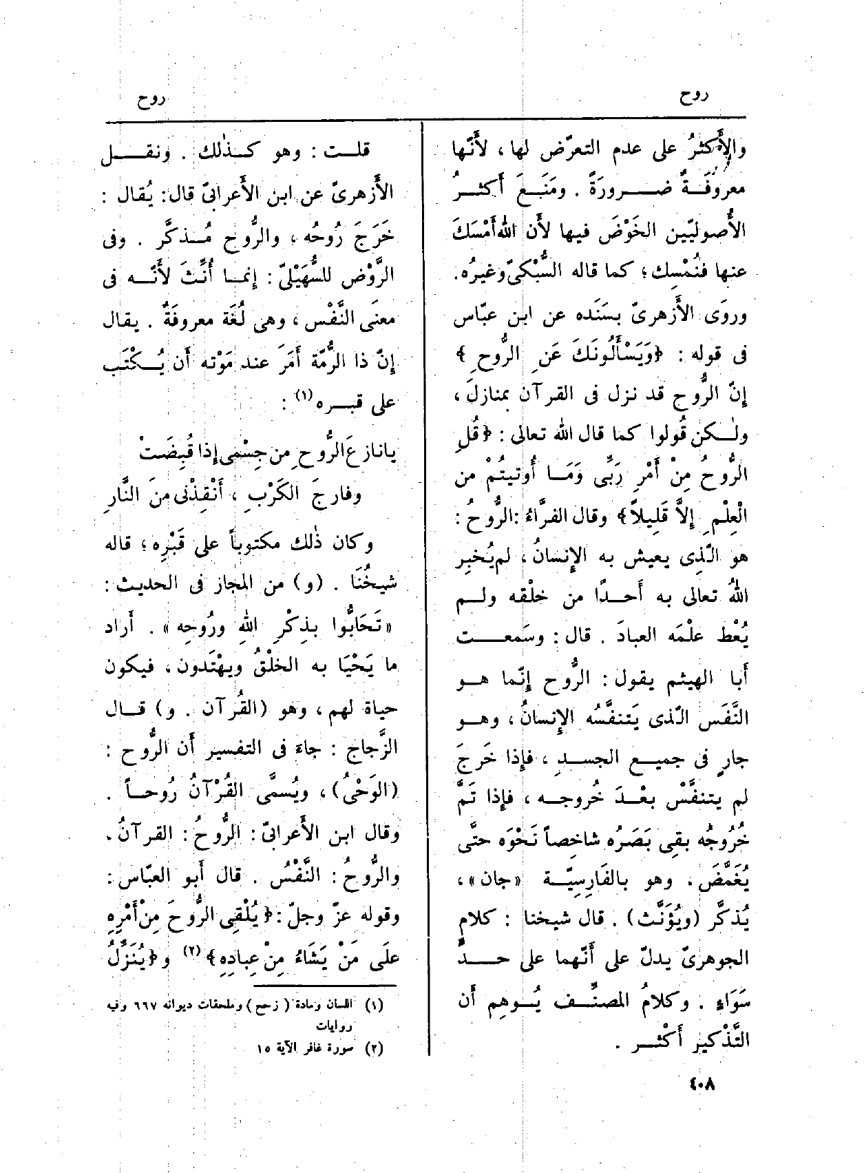 والأَكثرُ على عدم التعرّض لَهَا، لأَنّها معروفَةٌ ضرورَةً. ومَنَعَ أَكثرُ الأُصوليّين الخَوْضَ فِيهَا لأَن الله أَمْسَكَ عَنْهُمَا فنُمْسِك؛ كَمَا قَالَه السُّبْكيّ وغيرُه. وروَى الأَزهريّ بسَنَده عَن ابْن عبّاس فِي قَوْله: {6. 023 ويساءَلونك عَن الرّوح} إِنّ الرُّوح قد نزل فِي الْقُرْآن بمنازلَ، ولاكن قُولوا كَمَا قَالَ الله تَعَالَى: {6. 023 قل الرّوح من اءَمر رَبِّي. . قَلِيلا} وَقَالَ الفرَّاءُ: الرُّوحُ: هُوَ الّذِي يعِيش بِهِ الإِنسانُ، لم يُخبِر اللَّهُ تَعَالَى بِهِ أَحداً من خلْقه وَلم يُعْط علْمَه العبادَ. قَالَ: وسَمعت أَبا الْهَيْثَم يَقُول: الرُّوح إِنّما هُوَ النَّفَس الّذي يَتنفَّسُه الإِنسانُ، وَهُوَ جارٍ فِي جَمِيع الجَسدِ، فإِذا خَرجَ لم يتنفَّسْ بعْدَ خُروجه، فإِذا تَمَّ خُرُوجُه بقِي بَصَرُه شاخِصاً نَحْوَه حتَّى يُغَمَّضَ، وَهُوَ بالفَارِسِيّة (جَان) ، يُذكَّر (ويُؤَنَّث) . قَالَ شَيخنَا: كَلَام الجوهريّ يدلّ على أَنّهما على حدَ سَوَاءٍ. وكلامُ المصنِّف يُوهِم أَن التَّذْكير أَكثر.