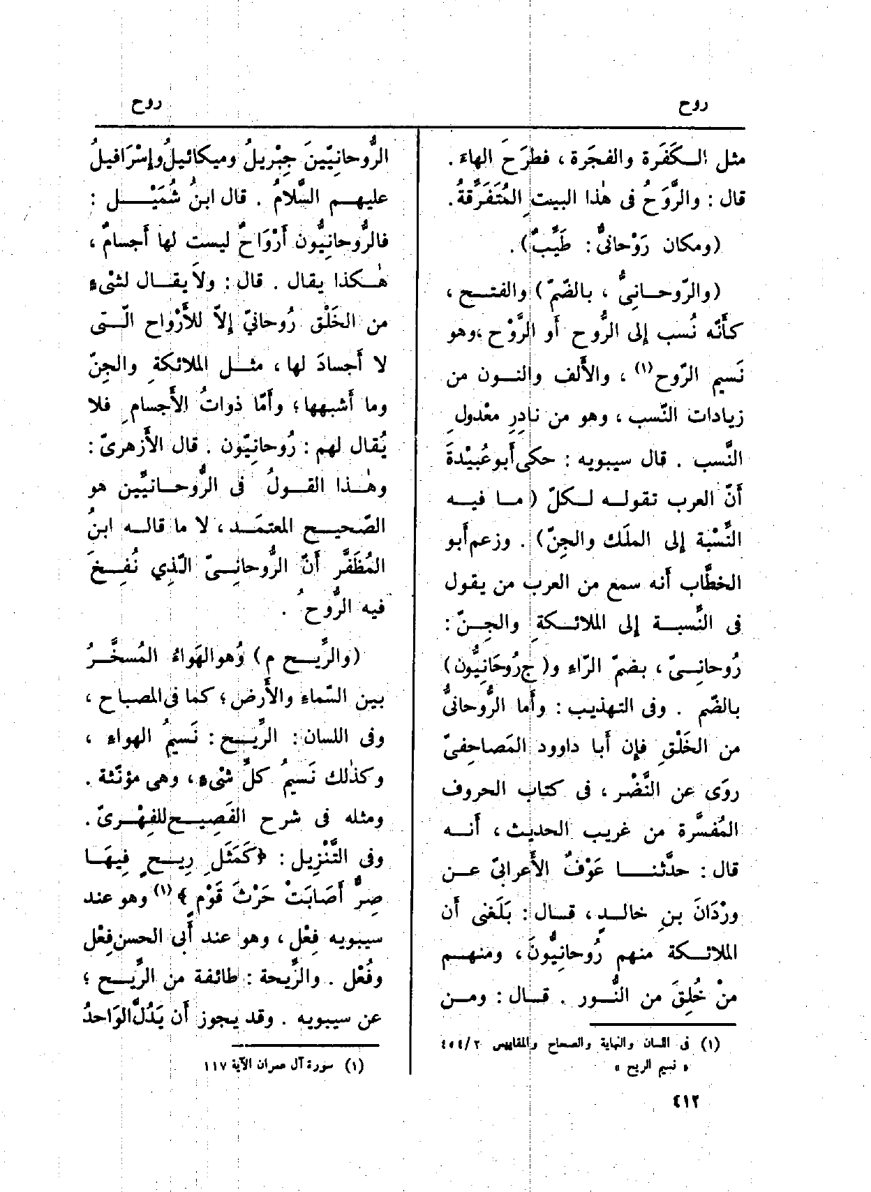 ( {والرّوحانِيُّ: بالضّمّ) وَالْفَتْح، كأَنّه نُسب إِلى الرُّوح أَو الرَّوْح، وَهُوَ نَسيم الرّوح، والأَلف وَالنُّون من زيادات النّسب، وَهُوَ من نادِرِ معْدولِ النَّسب. قَالَ سِيبَوَيْهٍ: حكى أَبو عُبيْدةَ أَنّ الْعَرَب تَقوله لكلّ (مَا فِيهِ النِّسْبة إِلى الملَك والجِن) . وَزعم أَبو الخطَّاب أَنه سمع من الْعَرَب من يَقُول فِي النِّسبة إِلى الملائكةِ والجِنّ: رُوحانِيّ، بضمّ الرّاء و (ج} رُوحَانِيُّون) بالضّم. وَفِي (التَّهْذِيب) : وأَما الرُّوحانيُّ من الخَلْقِ فإِن أَبا دَاوُود المَصاحِفيّ روَى عَن النِّضْر، فِي كتاب الْحُرُوف المُفسَّرة من غَرِيب الحَدِيث، أَنه قَالَ: حدَّثنا عَوْفٌ الأَعرابيّ عَن ورْدَانَ بنِ خالدٍ، قَالَ: بَلَغَني أَن الْمَلَائِكَة مِنْهُم رُوحانِيُّونَ، وَمِنْهُم منْ خُلِقَ من النُّور. قَالَ: وَمن الرُّوحانِيّينَ جِبْريلُ وميكائيلُ وإِسْرَافيلُ عَلَيْهِم السَّلامُ. قَالَ ابنُ شُمَيْل: {فالرُّوحانِيّون أَرْوَاحٌ لَيست لَهَا أَجسامٌ، هاكذا يُقَال. قَالَ: ولاَ يُقَال لشيْءٍ من الخَلْق رُوحانيّ إِلاّ للأَرْواح الّتي لَا أَجسادَ لَهَا، مثل الملائكةِ والجِنّ وَمَا أَشبهها؛ وأَمّا ذواتُ الأَجسامِ فَلَا يُقال لَهُم: رُوحانِيّون. قَالَ الأَزهريّ: وهاذا القولُ فِي} الروحانيِّين هُوَ الصَّحيح المعتمَد، لَا مَا قَالَه ابنُ المُظَفرَّ أَنّ {- الرُّوحانِيّ الّذي نُفِخَ فِيهِ الرُّوحُ.