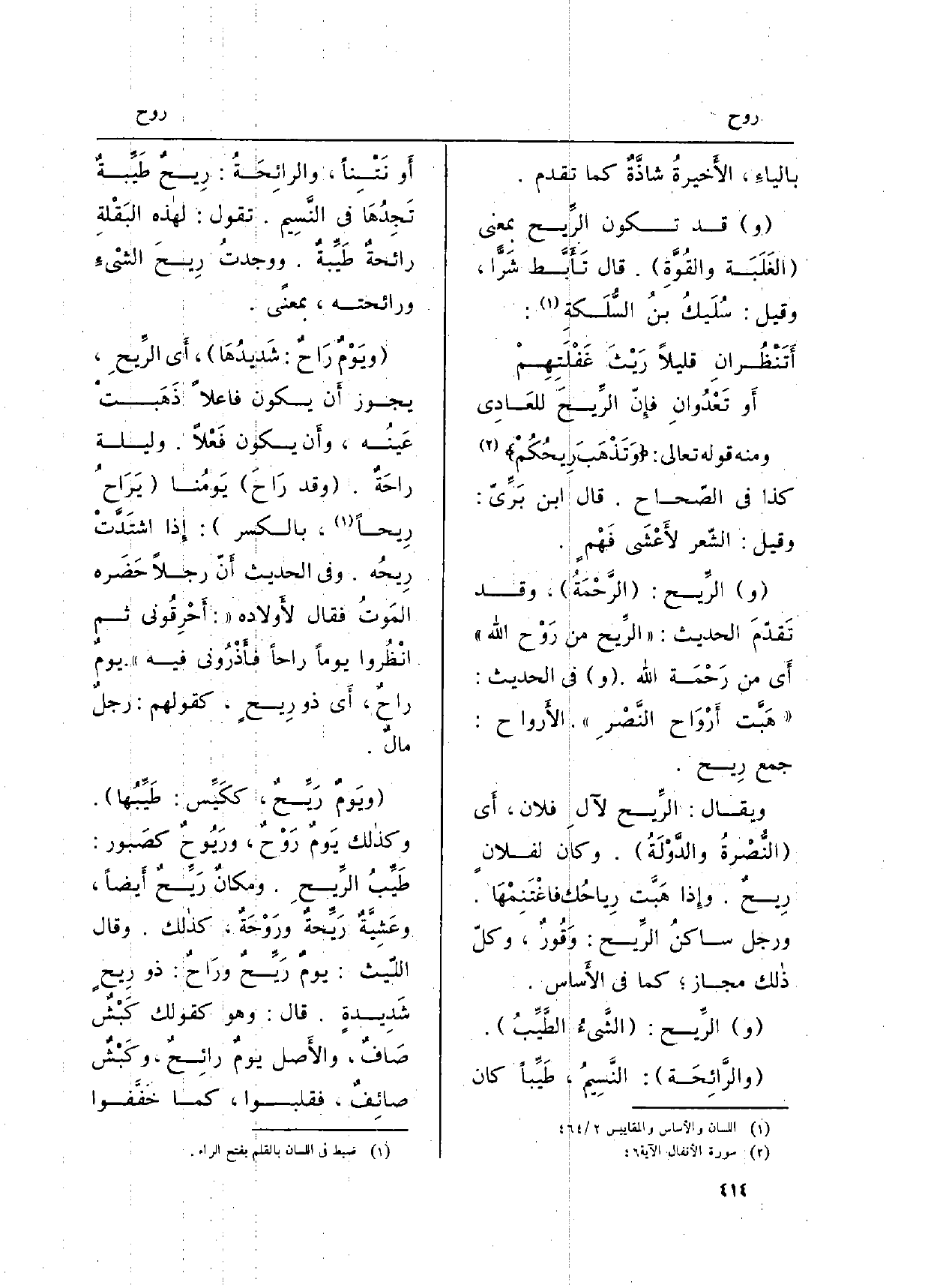 (و) الرِّيح: (الرَّحْمَةُ) ، وَقد تَقدّمَ الحَدِيث: (الرِّيح من رَوْح الله) . (و) فِي الحَدِيث (هَبَّت} أَرْوَاح النَّصْرِ) . الأَرواح: جمع رِيح.