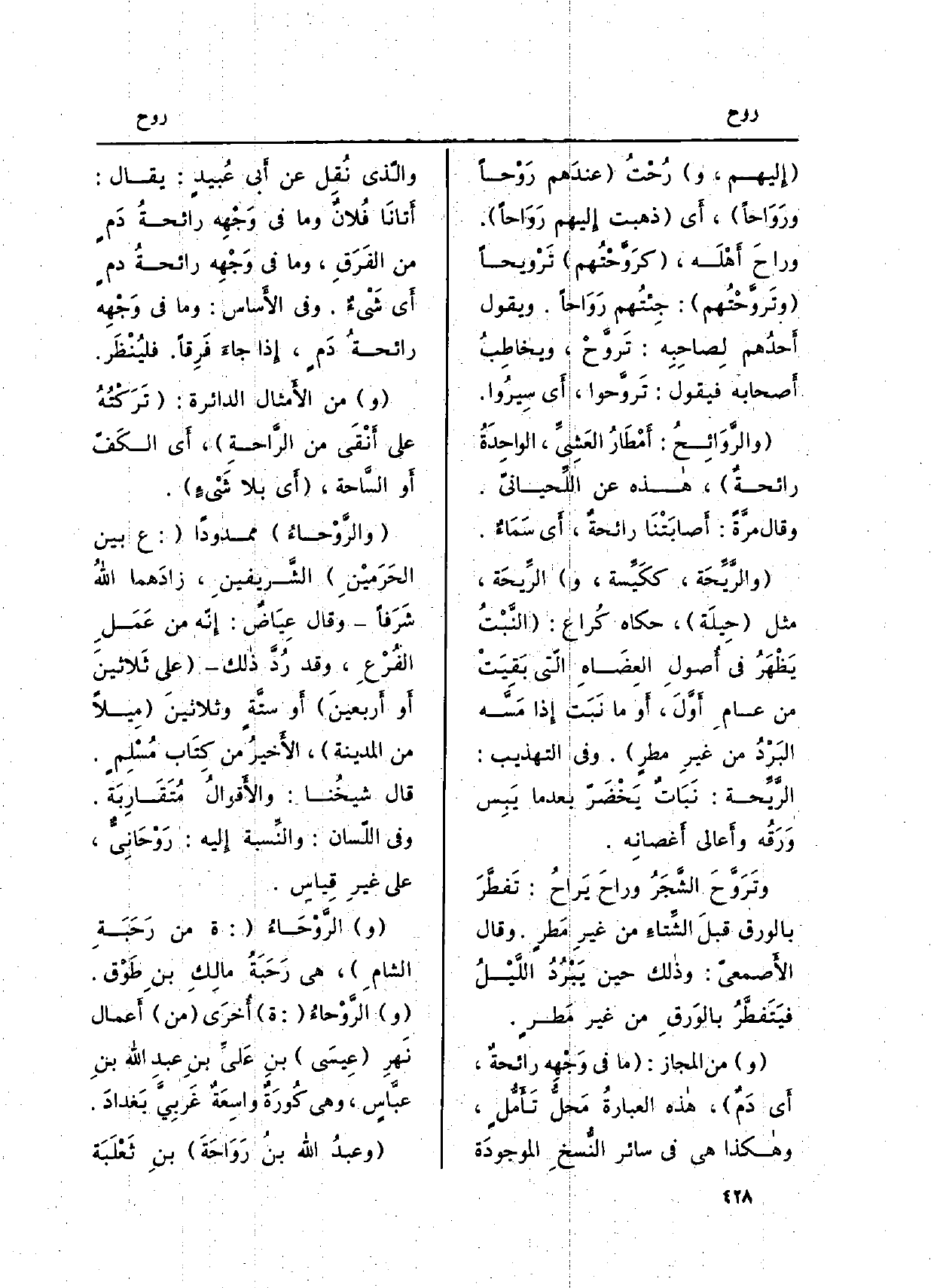 (و) من الْمجَاز: (مَا فِي وَجْهِه رائحةٌ، أَي دَمٌ) ، هاذه العبارةُ مَحلُّ تَأَمُّلٍ، وهاكذا هِيَ فِي سَائِر النُّسخِ الموجودَة والّذي نُقِل عَن أَبي عُبيدٍ: يُقَال: أَتانَا فُلانٌ وَمَا فِي وَجْهِه رائحةُ دَمٍ من الفَرَقِ، وَمَا فِي وجْهِه رائحةُ دمٍ أَي شَيْءٌ. وَفِي (الأَساس) : وَمَا فِي وَجْهِه رائحةُ دَمٍ، إِذا جاءَ فَرِقاً. فليُنْظَر.