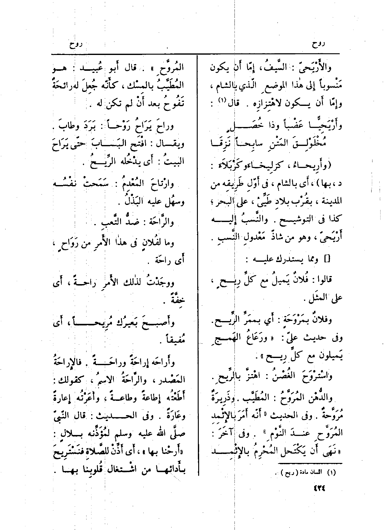والدُّهْن المُرَوَّحُ: المُطَيَّب. وذَرِيرَةٌ {مُرَوَّحةٌ. وَفِي الحَدِيث: (أَنّه أَمَرَ بالإِثْمِدِ المُرَوَّحِ عندَ النَّوْمِ) . وَفِي آخَرَ: (نَهَى أَن يَكْتَحل المُحْرِمُ بالإِثْمِد المُروَّحِ) . قَالَ أَبو عُبيد: هُوَ المُطَيَّبُ بالمِسْك، كأَنّه جُعِلَ لَهُ رائحَةٌ تَفُوحُ بعد أَنْ لم تكن لَهُ.