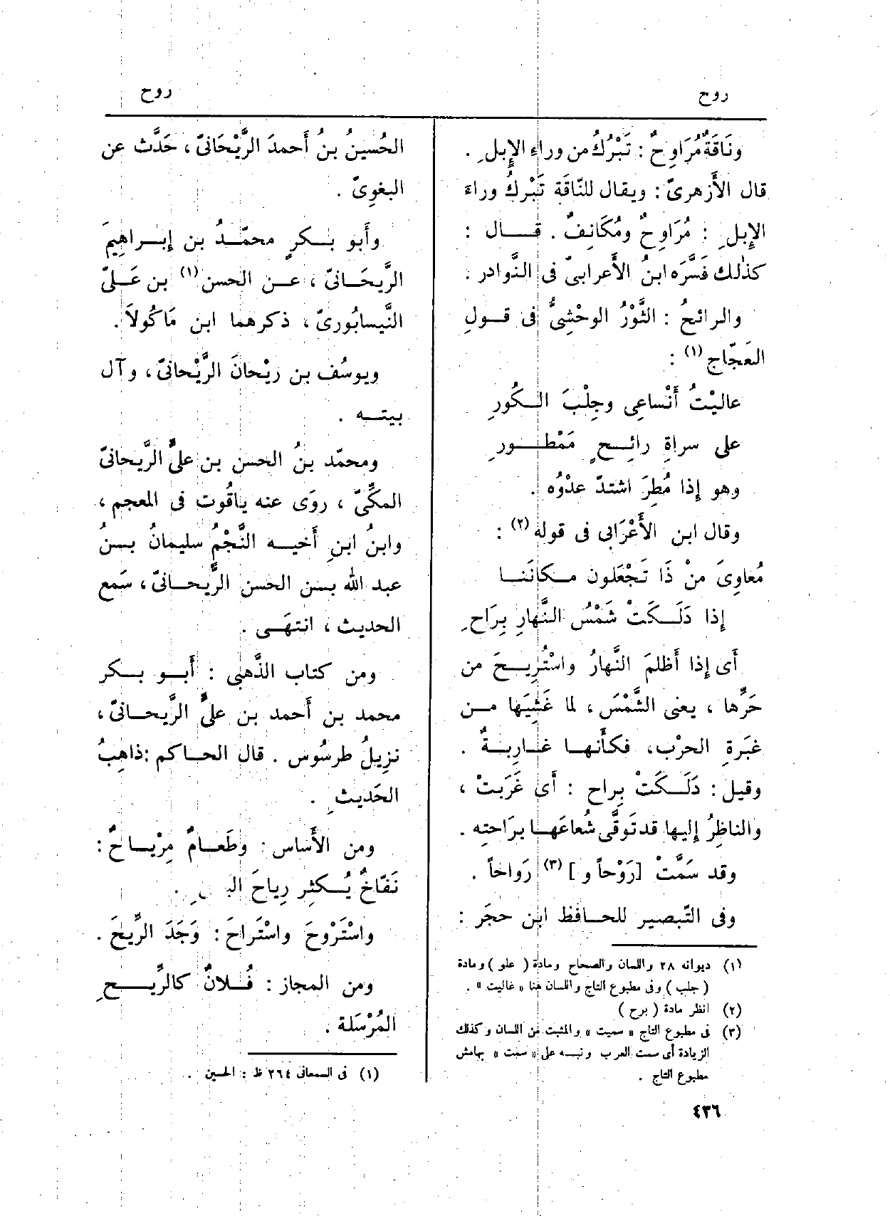 ونَاقَةٌ مُرَاوِحٌ: تَبْرُكُ من وراءِ الإِبلِ. قَالَ الأَزهريّ: وَيُقَال للنّاقَة تَبْركُ وراءَ الإِبلِ: {مُرَاوِحٌ ومُكَانِفٌ. قَالَ: كذالك فَسَّرَه ابنُ الاَرابيّ فِي النَّوادر.