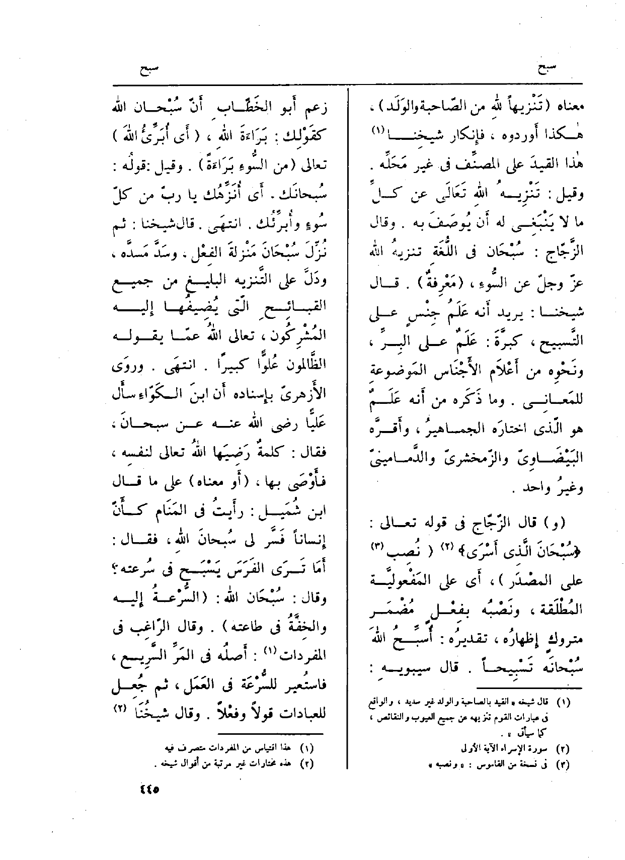 (و) قَالَ الزّجّاج فِي قَوْله تَعَالَى: {6. 025 سُبْحَانَ الَّذِي اءَسرى} (الإِسراء: 1) (نُصِب على المصْدَر) ، أَي على المَفْعوليَّة المُطْلَقة، ونَصْبُه بفِعْلٍ مُضْمَر متروكٍ إِظهارُه، تقديرُه: أُسبِّحُ اللَّهَ سُبْحَانَه تَسْبِيحاً. قَالَ سيبويهِ: زعم أَبو الخَطّابِ أَنّ سُبْحان الله كقَوْلِك: بَرَاءَةَ اللَّهِ، (أَي أُبَرِّءُ اللَّهَ) تَعَالَى (من السُّوءِ بَرَاءَةً) . وَقيل: قولُه: سُبحانَك، أَي أُنَزِّهُك يَا ربّ من كلّ سُوءٍ وأُبرِّئُك. انتَهى. قَالَ شَيخنَا: ثمَّ نُزِّلَ سُبْحَانَ مَنْزلةَ الفِعْل، وسَدَّ مَسدَّه، ودَلَّ على التَّنزيه البليغ من جَمِيع القبائِحِ الّتي يُضِيفُها إِليه المُشْرِكُون، تَعَالَى اللَّهُ عَمّا يَقُوله الظَّالمون عُلوًّا كَبِيرا. انتهَى. وروَى الأَزهريّ بإِسناده أَن ابنَ الكَوّاءِ سأَل عَليًّا رَضِي الله عَنهُ عَن سبحانَ، فَقَالَ: كلمةٌ رَضِيَها اللَّهُ تَعَالَى لنفسِه، فأَوْصَى بهَا، (أَو مَعْنَاهُ) على مَا قَالَ ابْن شُمَيل: رأَيتُ فِي المَنَام كأَنّ إِنساناً فَسَّر لي سُبحانَ اللَّهِ، فَقَالَ: أَمَا تَرَى الفَرَس يَسْبَح فِي سُرعته؟ وَقَالَ: سُبْحَان الله: (السُّرْعَةُ إِليه والخِفَّةُ فِي طَاعَته) . وَقَالَ الرُّاغِب فِي الْمُفْردَات: أَصلُه فِي المَرِّ السَّرِيع، فاستُعير للسُّرّعَة فِي العَمَل، ثمَّ جُعِل للعبادات قولا وفعْلاً. وَقَالَ شيخُنَا