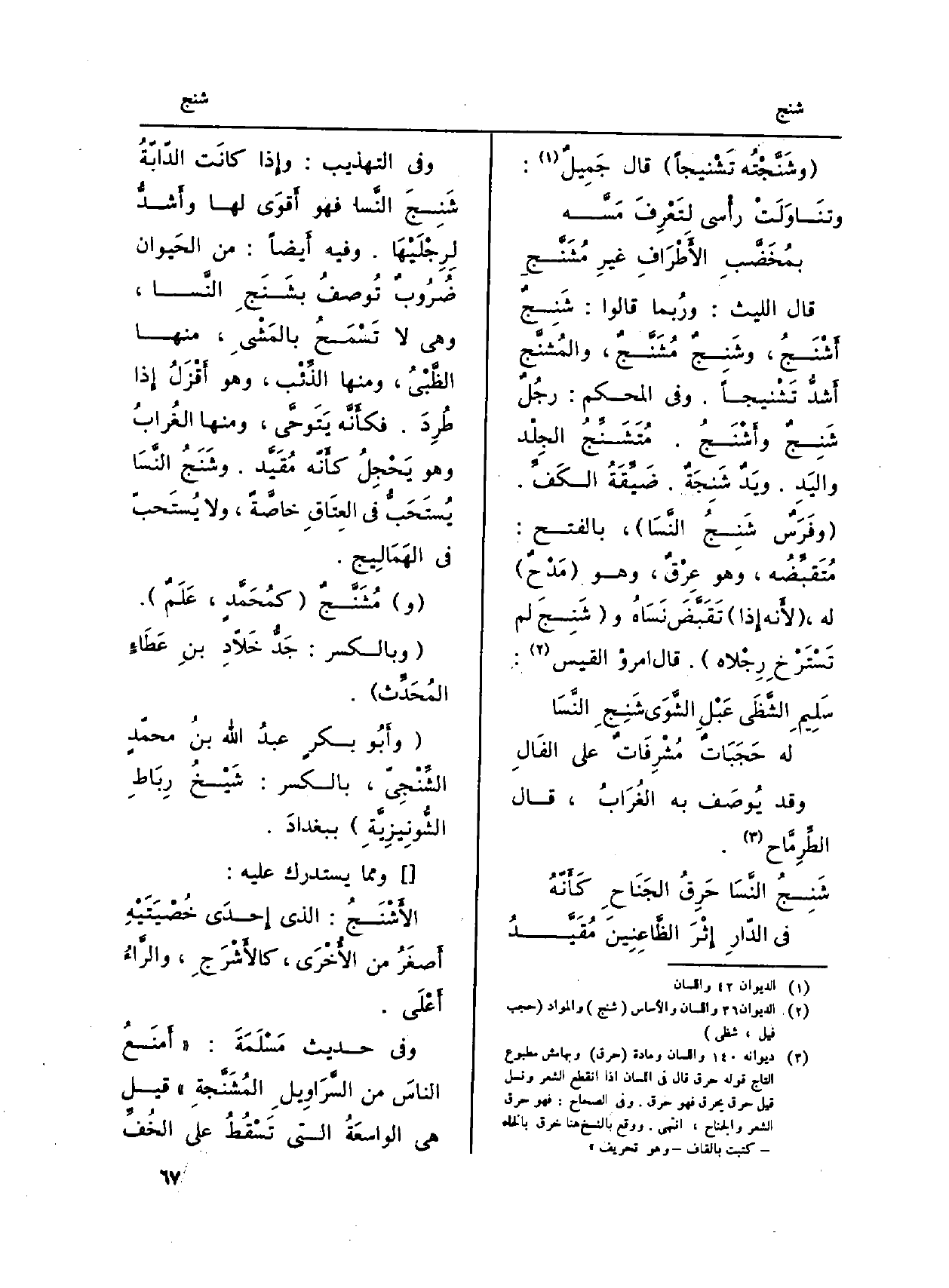 وَفِي (التَّهْذِيب) : وإِذا كانَت الدّابّةُ شَنِجَ النَّسا فَهُوَ أَقوَى لَهَا وأَشدُّ لرِجْلَيْهَا وَفِيه أَيضاً: من الحَيوان ضُرُوبٌ تُوصفُ بشَنَجِ النَّسَا، وَهِي لَا تَسمَحُ بالمَشْيِ، مِنْهَا الظَّبْيُ، وَمِنْهَا الذِّئْب، وَهُوَ أَقْزَلُ إِذا طُرِدَ. فكأَنَّه يَتَوحَّى، وَمِنْهَا الغُرَابُ وَهُوَ بَحْجِلُ كأَنّه مقَيَّد. وشَنَجُ النَّسَا يُستَحَبُّ فِي العِتَاقِ خاصَّةً، وَلَا يُسْتَحبّ فِي الهَمَالِيج.