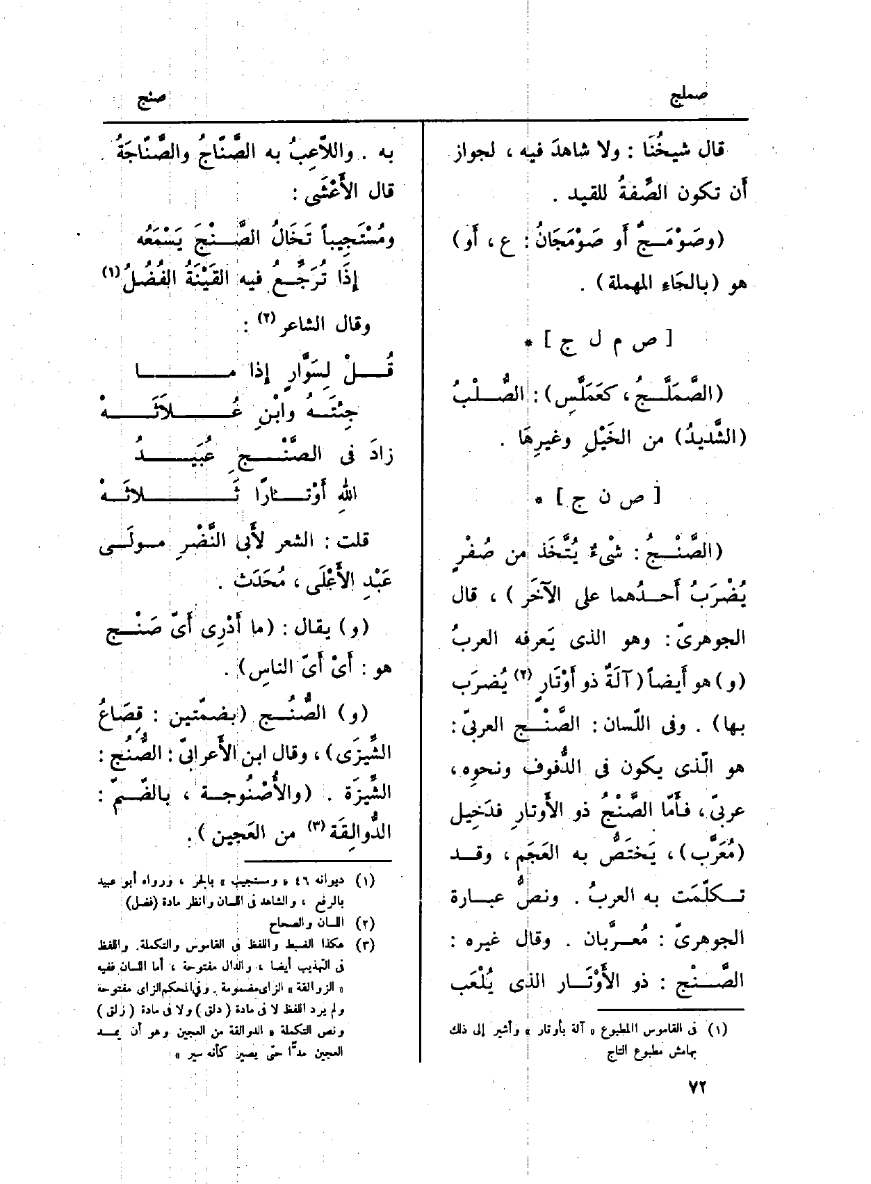 : (الصَّنْجُ: شيْءٌ يُتَّخَذ من صُفْرٍ يُضْرَبُ أَحدُهُما على الآخَر) قَالَ الجوهريّ: وَهُوَ الَّذِي يَعرفه العربُ (و) هُوَ أَيضاً (آلَةٌ ذُو أَوْتَارٍ يُضرَب بهَا) . وَفِي (اللِّسَان) : الصَّنْج العربيّ: هُوَ الّذي يكون فِي الدُّفوف ونحوِه، عربيّ، فأَمّا الصَّنْجُ ذُو الأَوتارِ فدَخِيل (مُعَرَّب) ، يَخْتَصُّ بِهِ العَجَم، وَقد تكلّمَت بِهِ العربُ. ونصُّ عبارَة الجوهريّ: مُعرَّبان. وَقَالَ غَيره: الصَّنْج: ذُو الأَوْتَار الَّذِي يُلْعَب بِهِ. واللاّعِبُ بِهِ الصَّنّاجُ والصَّنّاجَةُ. قَالَ الأَعْشَى: