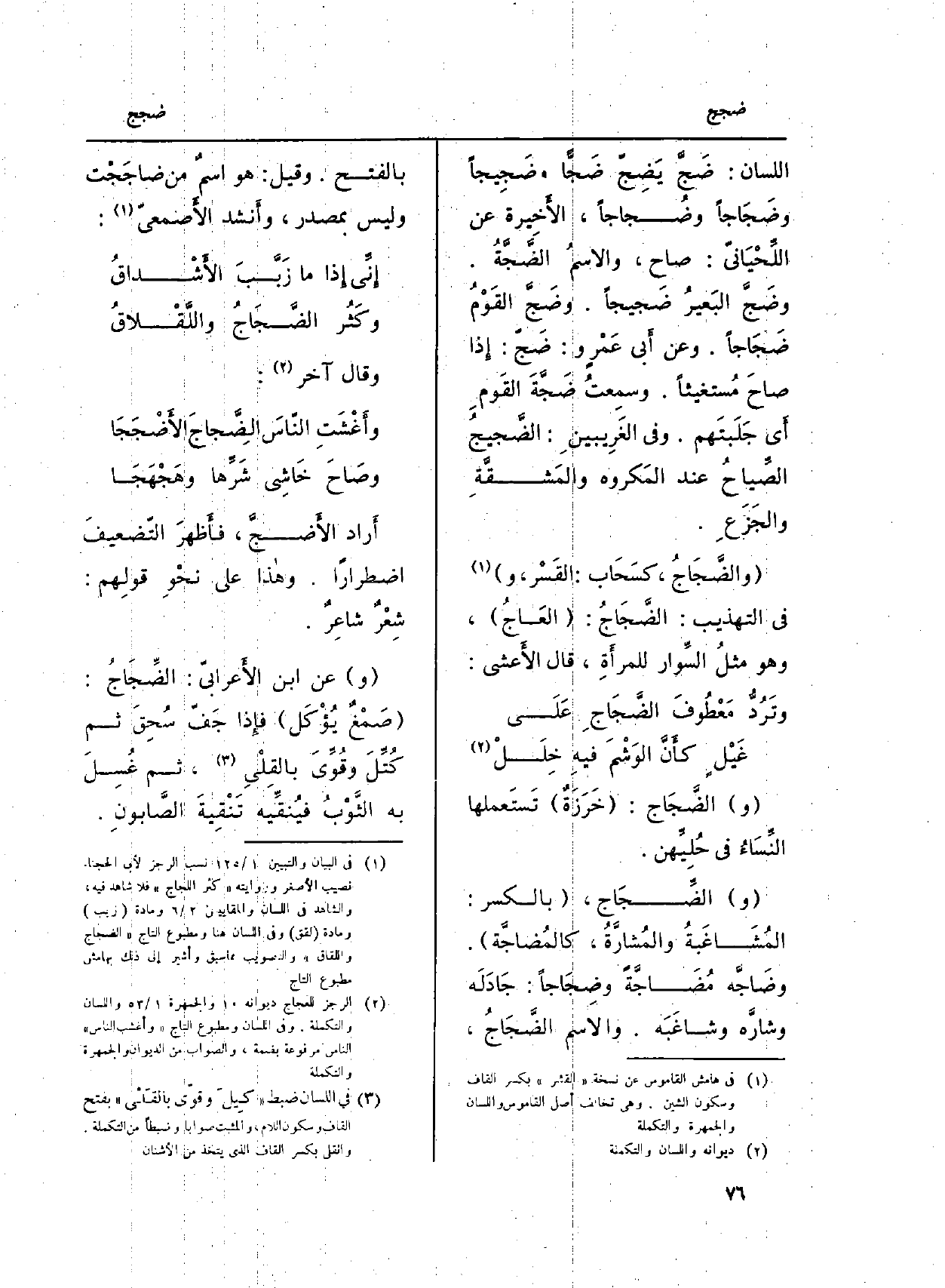 (اللِّسَان) : {ضَجَّ} يَضِجّ {ضَجًّا} وضَجِيجاً {وضَجَاجاً} وضُجاجاً، الأَخِيرة عَن اللِّحْيَانيّ: صَاح، والاسمُ {الضَّجَّة.} وضَجَّ البَعيرُ {ضَجيجاً.} وضَجَّ القَوْمُ {ضَجَاجاً. وَعَن أَبي عَمْرٍ و: ضَجّ: إِذا صاحَ مُستغيثاً. وسمِعتُ} ضَجَّةَ القَومِ أَي جَلَبتَهم. وَفِي الغَرِيبينِ: {الضَّجيجُ الصِّياحُ عِنْد المَكروه والمَشقَّةِ والجَزَعِ.