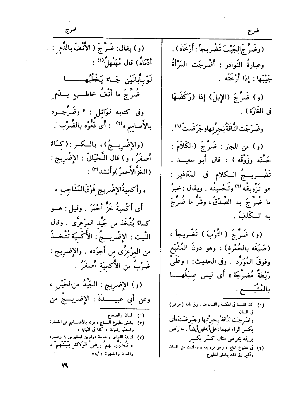 (و) من الْمجَاز: ضَرَّجَ (الكَلاَمَ: حَسَّنَه وزَوَّقَه) ، قَالَ أَبو سعيد: تَضْريجُ الْكَلَام فِي المَعَاذير: هُوَ تَزْويقُه وتَحْسينُه. وَيُقَال: خيرُ مَا ضُرِّجَ بِهِ الصَّدْقُ، وشَرُّ مَا ضُرِّجَ بِهِ الكَذبُ.