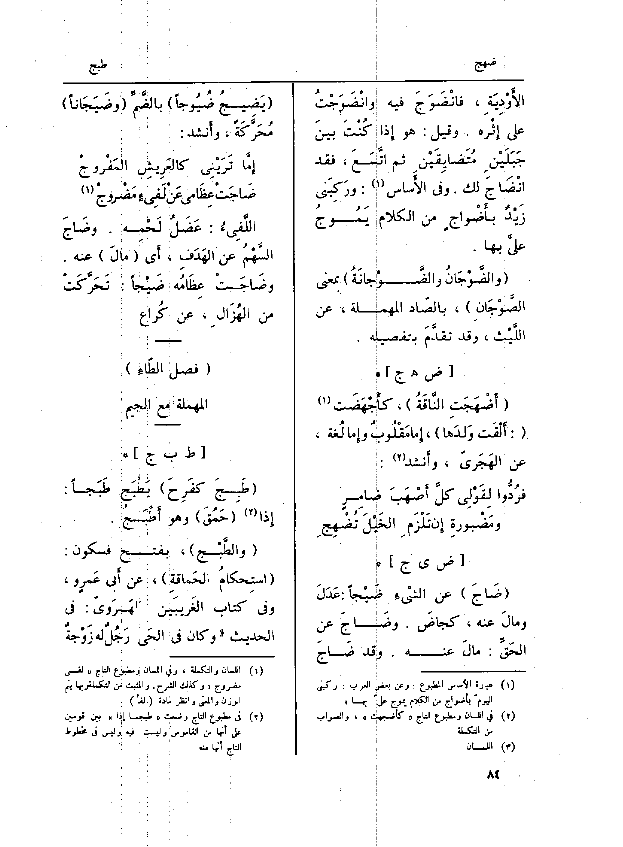 : ( {ضَاجَ) عَن الشيْءِ} ضَيْجاً: عَدَلَ ومالَ عَنهُ، كجاضَ. {وضَاجَ عَن الحَقِّ: مالَ عَنهُ. وَقد ضَاجَ (} يَضِيجُ {ضُيُوجاً) بالضَّمِّ (} وضَيَجَاناً) مُحَرَّكَةً، وأَنشد: