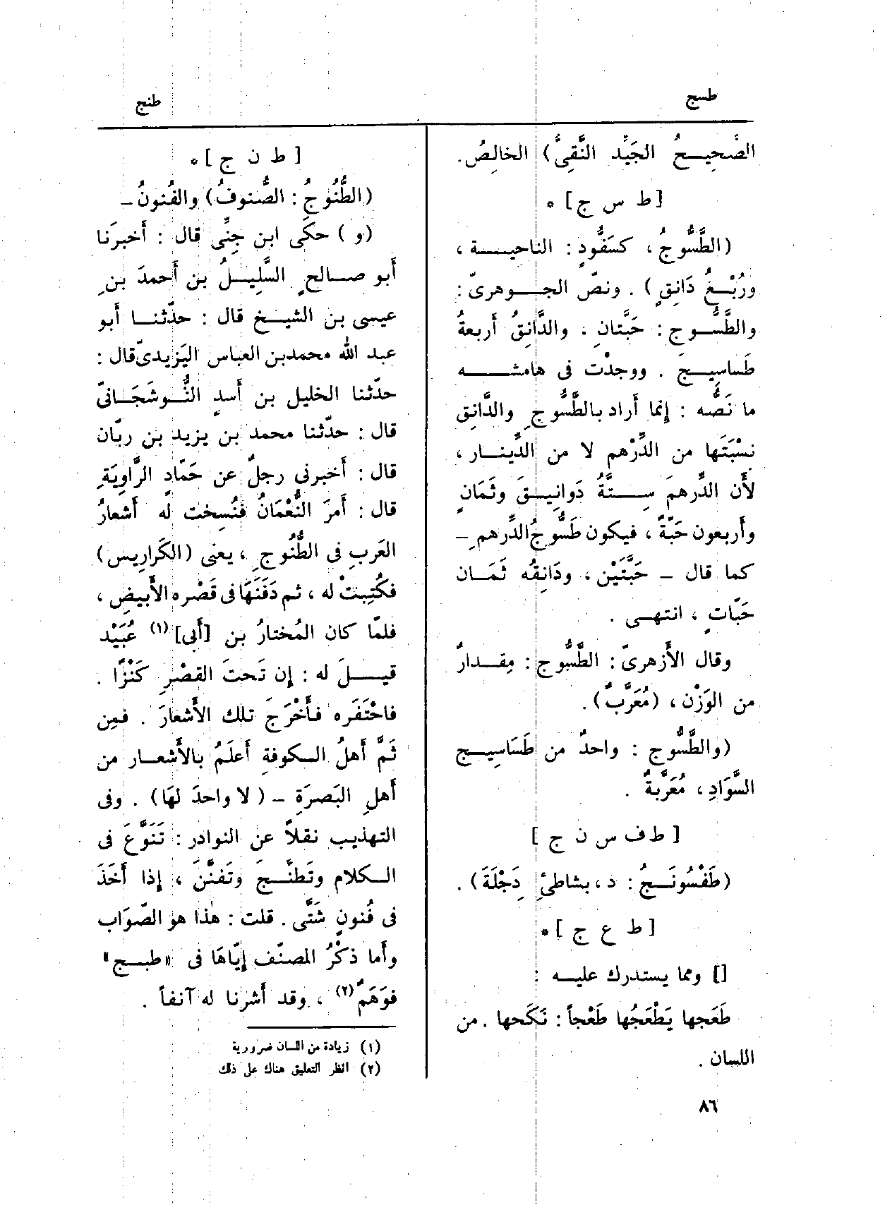 (و) حكَى ابْن جِنِّي قَالَ: أَخبرَنا أَبو صالحٍ السَّلِيلُ بن أَحمدَ بنِ عِيسَى بن الشَّيْخ قَالَ: حَدثنَا أَبو عبد الله مُحَمَّد بن الْعَبَّاس اليَزيديّ قَالَ: حَدثنَا الْخَلِيل بن أَسدٍ النُّوشَجَانيّ قَالَ: حَدثنَا مُحَمَّد بن يزِيد بن ربّان قَالَ: أَخبرني رجلٌ عَن حَمّادٍ الرَّاوِيَةِ قَالَ: أَمرَ النُّعْمَانُ فنُسِخت لَهُ أَشعارُ العَربِ فِي الطُّنُوجِ، يَعْنِي (الكَرارِيس) فكُتِبتْ لَهُ، ثمَّ دَفَنَهَا فِي قَصْره الأَبيضِ، فلمّا كَانَ المُختارُ بن (أَبي) عُبَيْد قيلَ لَهُ: إِن تَحتَ القصْرِ كَنْزاً. فاحْتَفَره فأَخْرَجَ تِلْكَ الأَشعارَ. فمِن ثَمَّ أَهلُ الكوفةِ أَعلَمُ بالأَشعار من أَهلِ البَصرَةِ (لَا واحدَ لهَا) . وَفِي (التَّهْذِيب) نقلا عَن النَّوَادِر: تَنَوَّعَ فِي الْكَلَام وتَطنَّجَ وتَفنَّنَ، إِذا أَخَذَ فِي فُنونٍ شَتَّى. قلت: هاذا هُوَ الصّوَاب وأَما ذكُرْ المصنْف إِيّاهَا فِي (طبج) فوَهَمٌ، وَقد أَشرنا لَهُ آنِفا.