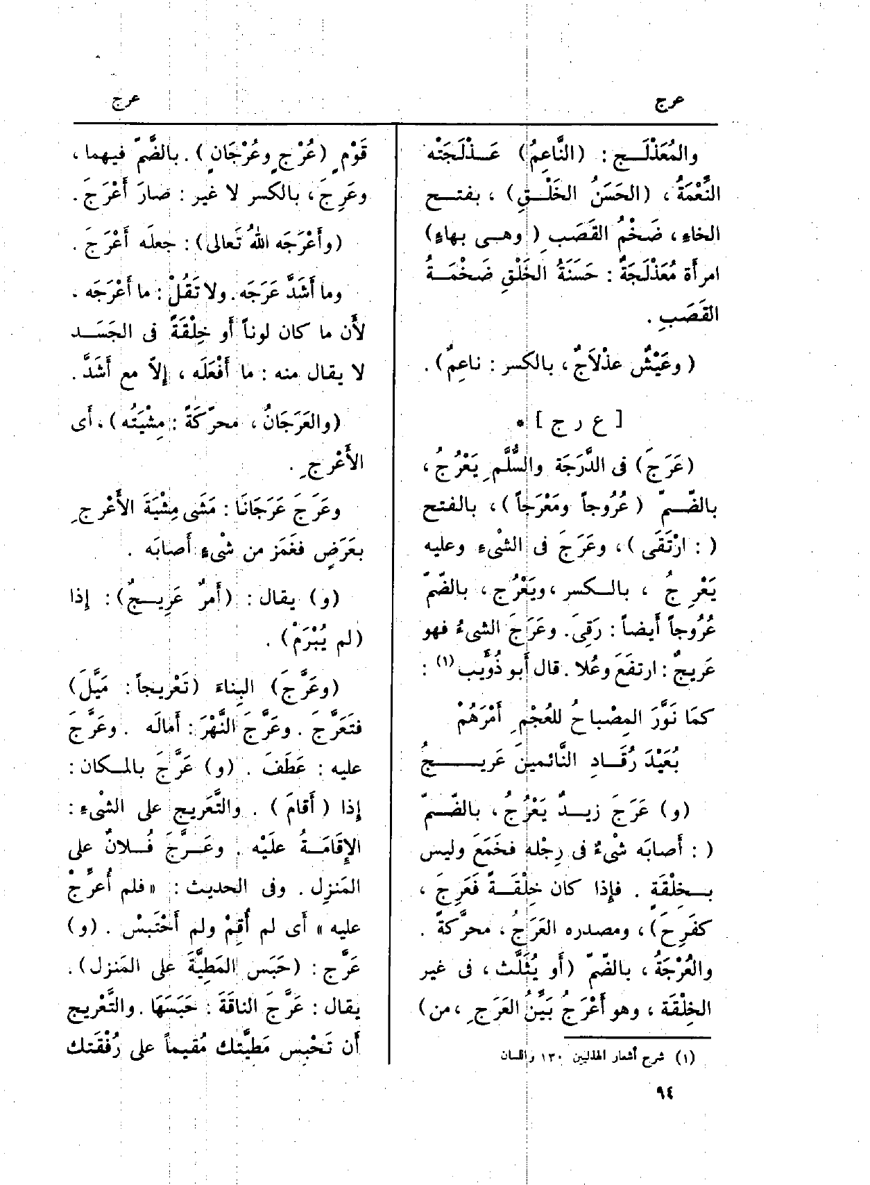 (و) عَرَجَ زيدٌ يَعْرُجُ، بالضّمّ (: أَصابَه شيْءٌ فِي رِجْله فخَمَعَ وَلَيْسَ بخِلْقَةٍ. فإِذا كَانَ خِلْقَةً فَعَرِجَ، كفَرِحَ) ، ومصدره العَرَجُ، محرَّكةً. والعُرْجَةُ، بالضّمّ (أَو يُثَلَّث، فِي غير الخِلْقَة، وَهُوَ أَعْرَجُ بَيِّنُ العَرَجِ، من) قَوْمٍ (عُرْجٍ وعُرْجَانٍ) . بالضَّمّ فيهمَا، وعَرِجَ، بِالْكَسْرِ لَا غير: صارَ أَعْرَجَ.