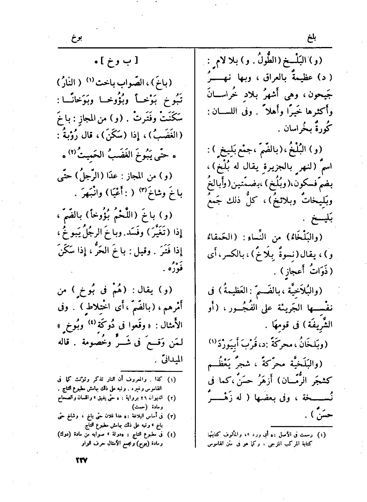 : ( {باخَ) ، الصّواب} باخت (النّارُ) {تَبُوخ} بَوْخاً {وبُؤُوخاً} وبَوَخاناً: سَكَنَتْ وفَتَرتْ. (و) من المجازِ: باخَ (الغَضَبُ) ، إِذا (سَكَنَ) ، قَالَ رُؤبةُ: