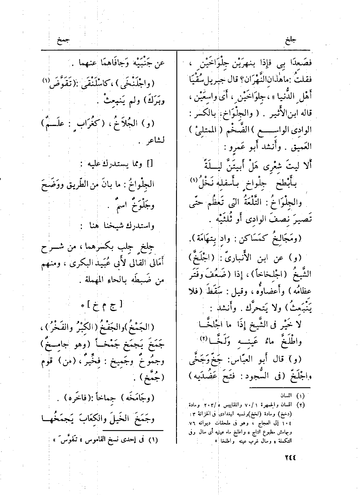 فصَعِدَا بِي فإِذا بنهرَيْن جِلْوَاخَيْنِ، فقلتُ: مَا هاذان النَّهْرَان؟ قَالَ جِبْرِيل سُقْيَا أَهِلِ الدُّنيا) ، جِلوَاخَيْنِ، أَي واسِعَيْن، قَالَه ابْن الأَثير. (والجِلْوَاخ، بِالْكَسْرِ: الوادِي الواسِع) الضَّخْم (الممتلِىء) العَميق. وأَنشد أَبو عَمرٍ و: