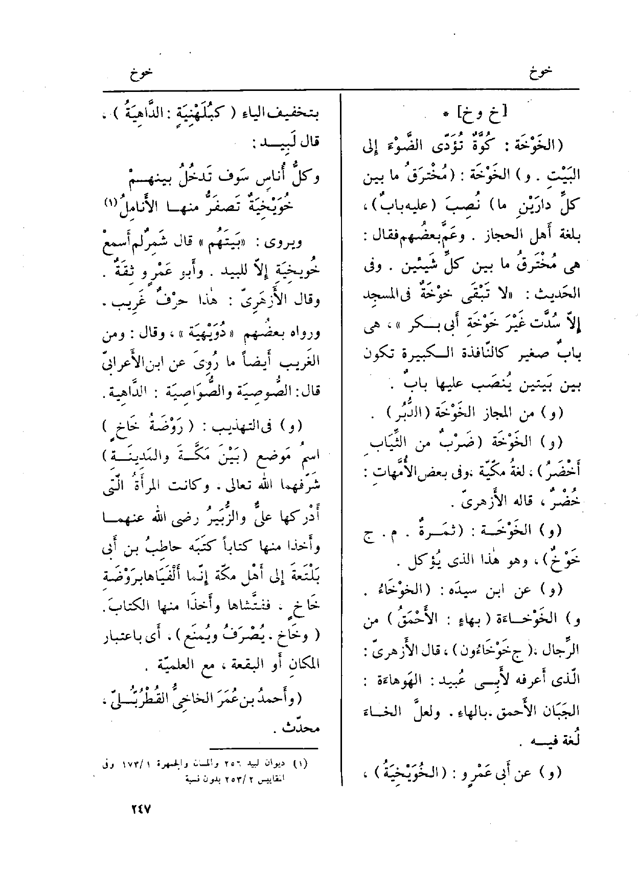 ويروى: (بَيتَهُم) قَالَ شَمِرٌ لم أَسمعْ خُويخِيَة إِلاّ للبيد. وأَبو عَمْرٍ وثِقَةٌ. وَقَالَ الأَزهَرِيّ: هاذا حرْفٌ غَرِيب، وَرَوَاهُ بعضُهم (دُوَيْهيَة) ، وَقَالَ: وَمن الْغَرِيب أَيضاً مَا رُوِيَ عَن ابْن الأَعرابيّ قَالَ: الصُّوصِيَة والصُّوَاصِيَة: الدَّاهِية.