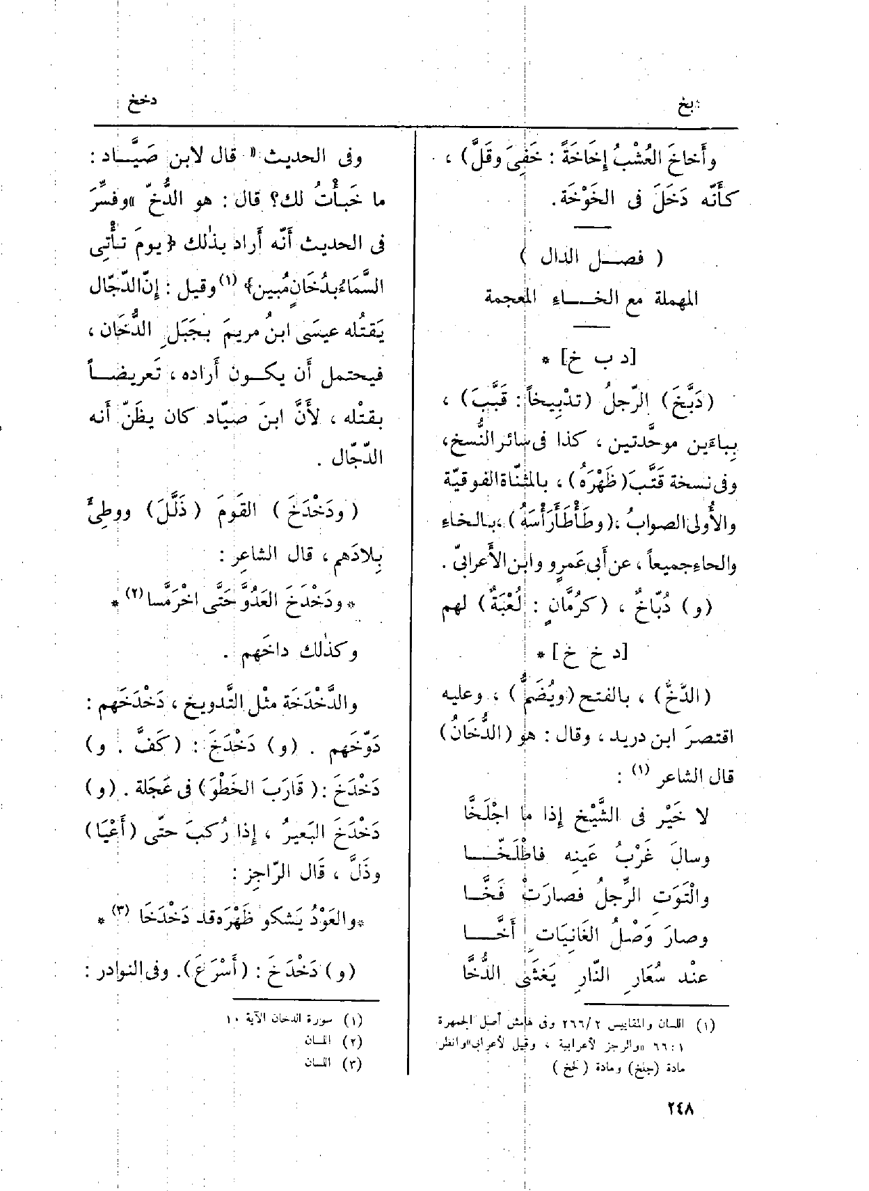وَفِي الحَدِيث: (قَالَ لِابْنِ صَيَّاد: مَا خَبأْتُ لَك؟ قَالَ هُوَ} الدُّخّ) وفسِّرَ فِي الحَدِيث أَنّه أَراد بذالك {7. 014 يَوْم تاءْتي. . بِدُخَان مُبين} (الدُّخان: 10) وَقيل: إِنّ الدّجّال يَقتُله عيسَى ابنُ مريمَ بجَبَلِ الدُّخَان، فَيحْتَمل أَن يكون أَراده، تَعريضاً بقتْله، لأَنَّ ابنَ صيّاد كَانَ يظَنّ أَنه الدّجّال.