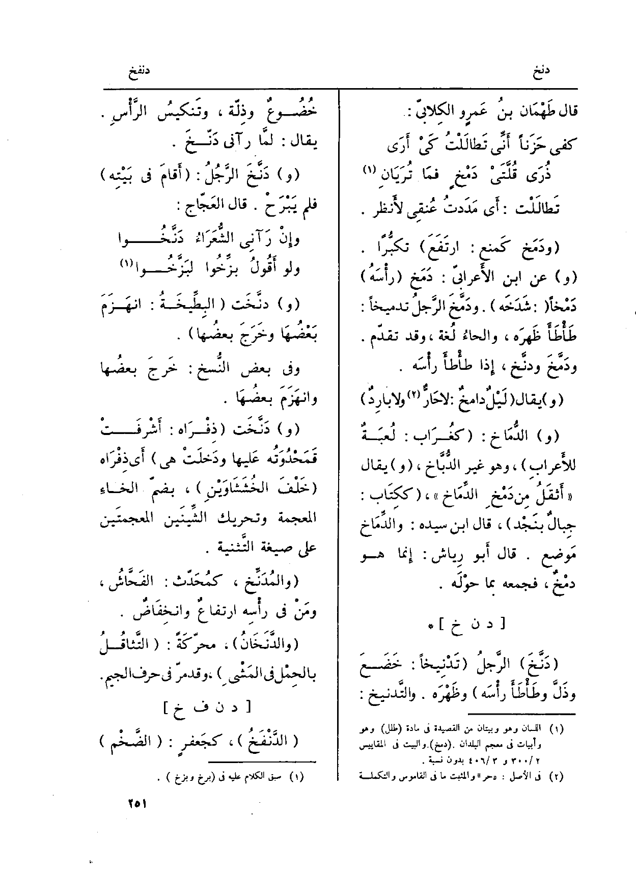 (ودَمَخ كَمنع: ارتَفَعَ) تكبُّرًا. (و) عَن ابْن الأَعرابيّ: دَمَخ (رأْسَهُ) دَمْخاً (: شَدَخَه) . ودَمَّخَ الرَّجلُ تدميخاً: طَأْطَأَ ظَهرَه، والحاءُ لُغة، وَقد تقدّم. ودَمَّخَ ودنَّخ، إِذا طأْطأَ رأْسَه.