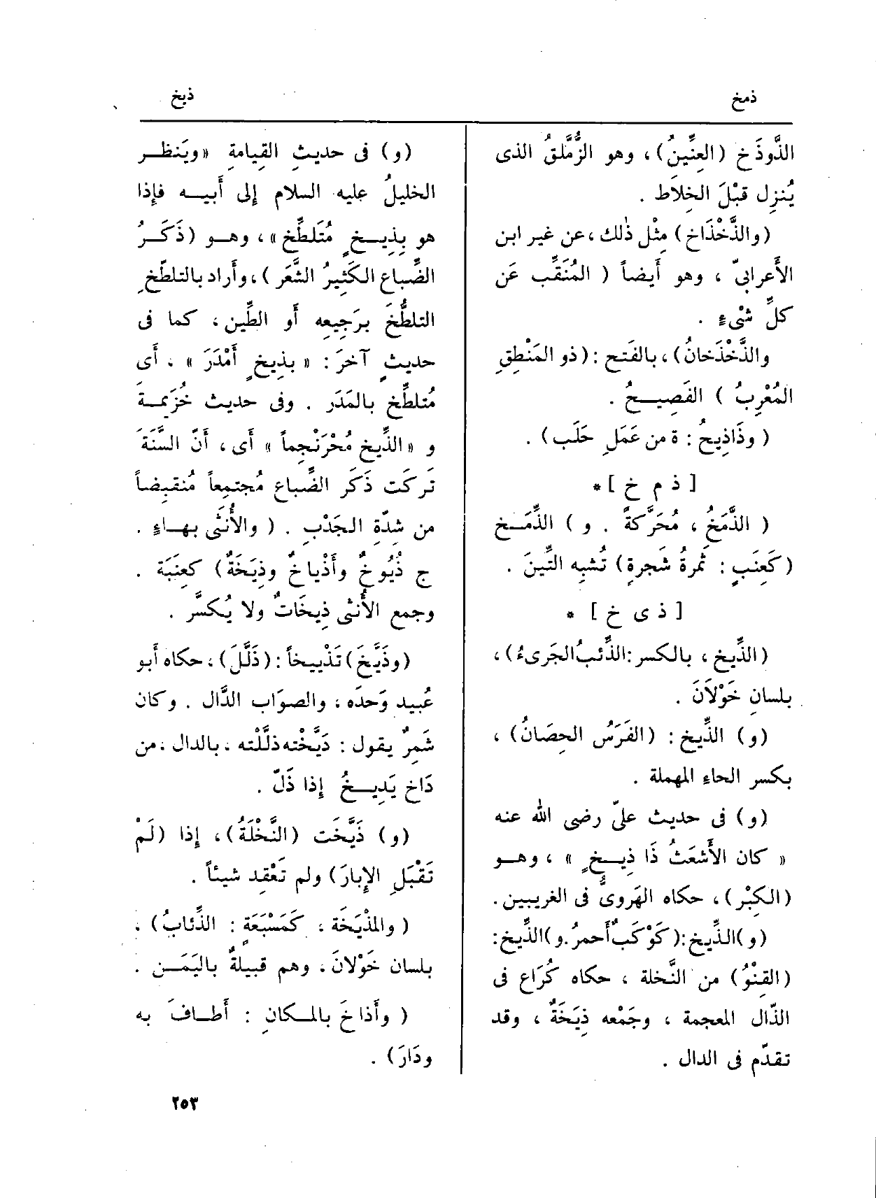 (و) فِي حديثِ القِيامةِ (ويَنظر الخيلُ عَلَيْهِ السَّلَام إِلى أَبيه فإِذا هُوَ} بِذِيخٍ مُتَلطِّخ) ، وَهُوَ (ذَكَرُ الضِّباع الكَثِيرُ الشَّعَر) ، وأَراد بالتلطّخِ التلطُّخَ برَجِيعِه أَو الطَّين، كَمَا فِي حَدِيث آخَر: ( {بذِيخٍ أَمْدَرَ) ، أَي مُتلطِّخ بالمَدَر. [وَفِي حَدِيث خُزَيمةَ و (الدِّيخ مُحْرَنْجِماً) أَي، أَنّ السَّنَةَ تَركَت ذَكَر الضِّباع مُجتمِعاً مُنقبِضاً من شِدّة الجَدْبِ. (والأَنثَى بهاءٍ. ج} ذُيُوخٌ {وأَذْياخٌ} وذِيَخَةٌ) كعِنَبَة. وَجمع الأُنثى {ذِيخَاتٌ وَلَا يُكسَّر.