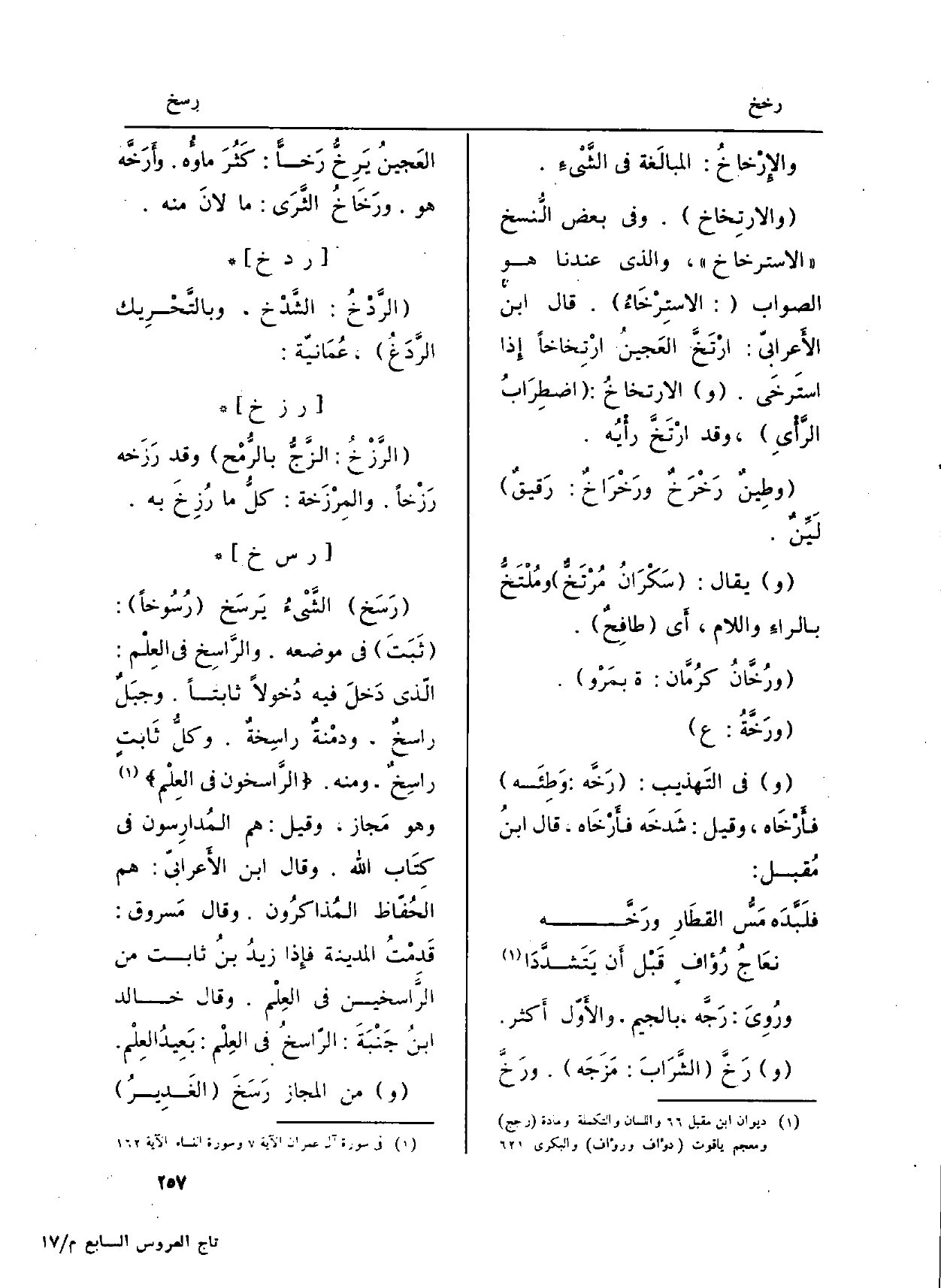 : (رَسَخ) الشَّيْءُ يَرسَخ (رُسُوخاً) : (ثَبَتَ) فِي مَوْضِعه. والرَّاسِخ فِي العِلْم: الّذي دَخَلَ فِيهِ دُخُولاً ثَابتا. وجبَلٌ راسخٌ، ودِمْنةٌ راسِخةٌ. وكلُّ ثَابتٍ راسِخٌ، وَمِنْه. {الرَّاسِخُونَ فِى الْعِلْمِ} (آل عمرَان: 7) وَهُوَ مَجاز، وَقيل: هم المُدارِسون فِي كِتَاب الله. وَقَالَ ابْن الأَعرابيّ: هم الحُفّاظ المُذاكرُون. وَقَالَ مَسروق: قَدِمْتُ الْمَدِينَة فإِذا زيدُ بنُ ثابتِ من الرَّاسخين فِي العِلْم. وَقَالَ خَالِد بنُ جَنْبَةَ: الرّاسخُ فِي العِلْم: بَعِيدُ العِلْم.