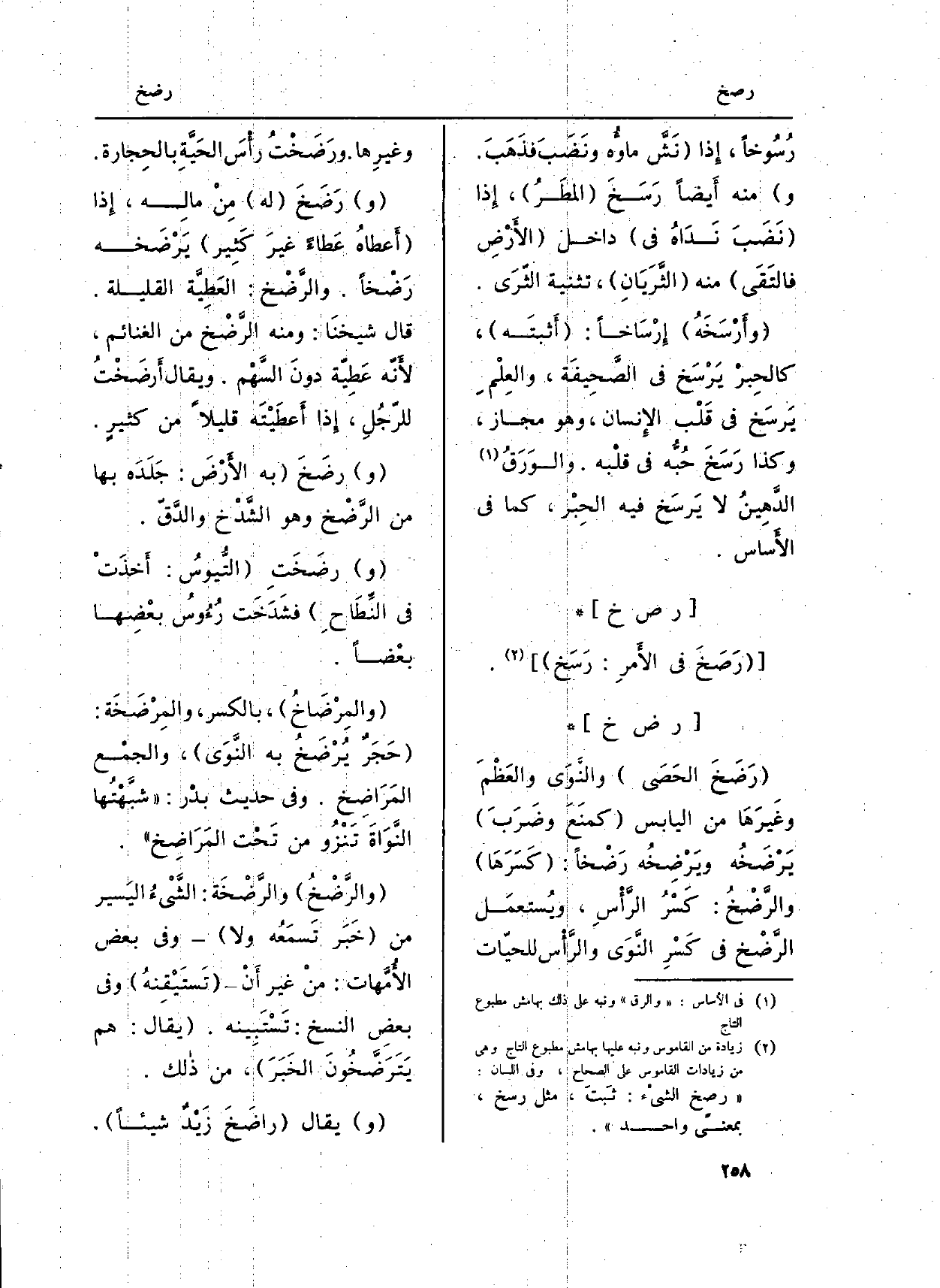 : (رَضَخَ الحَصَى) والنَّوَى والعَظْمَ وغَيرَهَا من الْيَابِس (كمَنَع وضَرَبَ) يَرْضَخُه ويَرْضِخُه رَضْخاً: (كَسَرَهَا) والرَّضْخُ: كَسْرُ الرَّأْسِ، ويُستعمَل الرَّضْخ فِي كَسْرِ النَّوَى والرَّأْس للحيّات وغيرِها. ورَضَخْتُ رأْسَ الحَيَّةِ بالحِجارة.