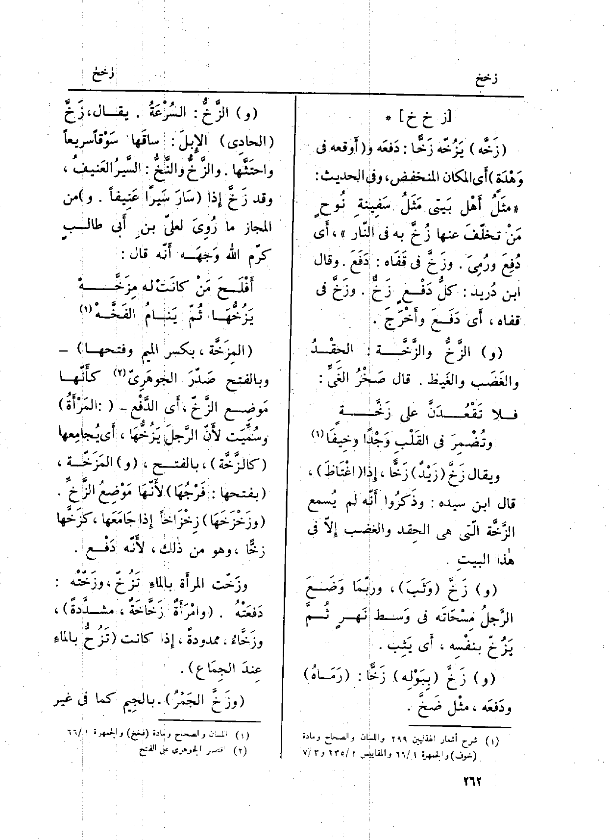 : ( {زَخَّه) } يَزُخّه {زَخًّا: دَفَعه و (وقعه فِي وَهُدَةٍ) أَي الْمَكَان المنخفض، وَفِي الحَدِيث: (مثَلُ أَهْل بَيتي مَثَلُ سَفِينةِ نُوحٍ مَنْ تخلّفَ عَنْهَا زُخَّ بِهِ فِي النّار) ، أَي دُفِعَ ورُمِيَ.} وزَخَّ فِي قَفاهُ، وَقَالَ ابْن جريج: كل دفع {زَخٌّ،} وزَخَّ فِي قَفاهُ أَي دَفَعَ وأَخْرَجَ.