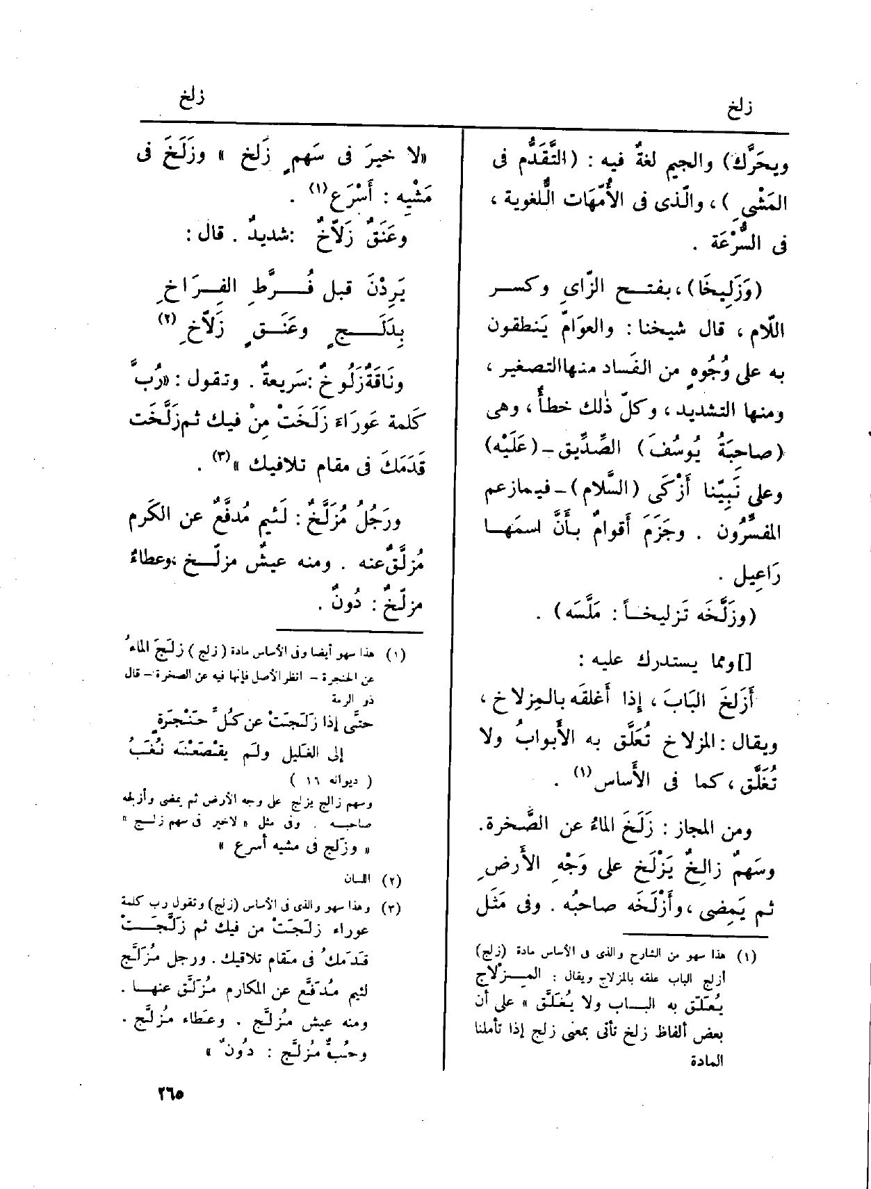 ونَاقَةٌ زَلُوخٌ: سَريعةٌ. وَتقول: (رُبَّ كَلمة عَورَاءَ زَلَخَتْ مِنْ فِيك ثمَّ زَلَّخَت قَدَمَكَ فِي مقَام تلافيك) .