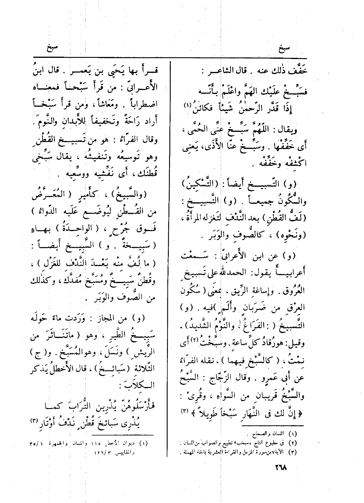 (و) عَن ابْن الأَعرابيّ: سَمعْت أَعرابيًّا يَقُول: الْحَمد لله على تَسبيخِ العُرُوق. وإِساغةِ الرِّيق، بمعنَى (سُكُون العِرْقِ من ضَرَبانٍ وأَلَمٍ) فِيهِ. والتَّسبيخُ (: الفَرَاغُ، والنَّوْمُ الشَّديدُ) ، وَقيل: هُوَ رُقادُ كلِّ ساعةٍ. وسبَّخْتُ أَي نِمْتُ، (كالسَّبْخِ فيهمَا) ، نَقله الفرّاءُ عَن أَبي عَمرٍ و. وَقَالَ الزّجّاج: السَّبْحُ والسَّبْخُ قَريبانِ من السَّواءِ، وقُرِىء: {7. 015 ان لَك فِي النَّهَار. . طَويلا} (المزمل: 7) قرأَ بهَا يَحيى بن يَعمر. قَالَ ابنُ الأَعرابيّ: من قَرأَ سَبْحاً فَمَعْنَاه اضطراباً. ومَعَاشاً، وَمن قرأَ سَبْخاً أَراد رَاحَةً وتَخفيفاً للأَبدانِ والنَّومَ. وَقَالَ الفرّاءُ: هُوَ من تَسبيخ القُطْنِ وَهُوَ تَوسيعُه وتَنفيشُه، يُقَال سَبِّخِي قُطنَك، أَي نَفِّشِيه ووسِّعِيه.