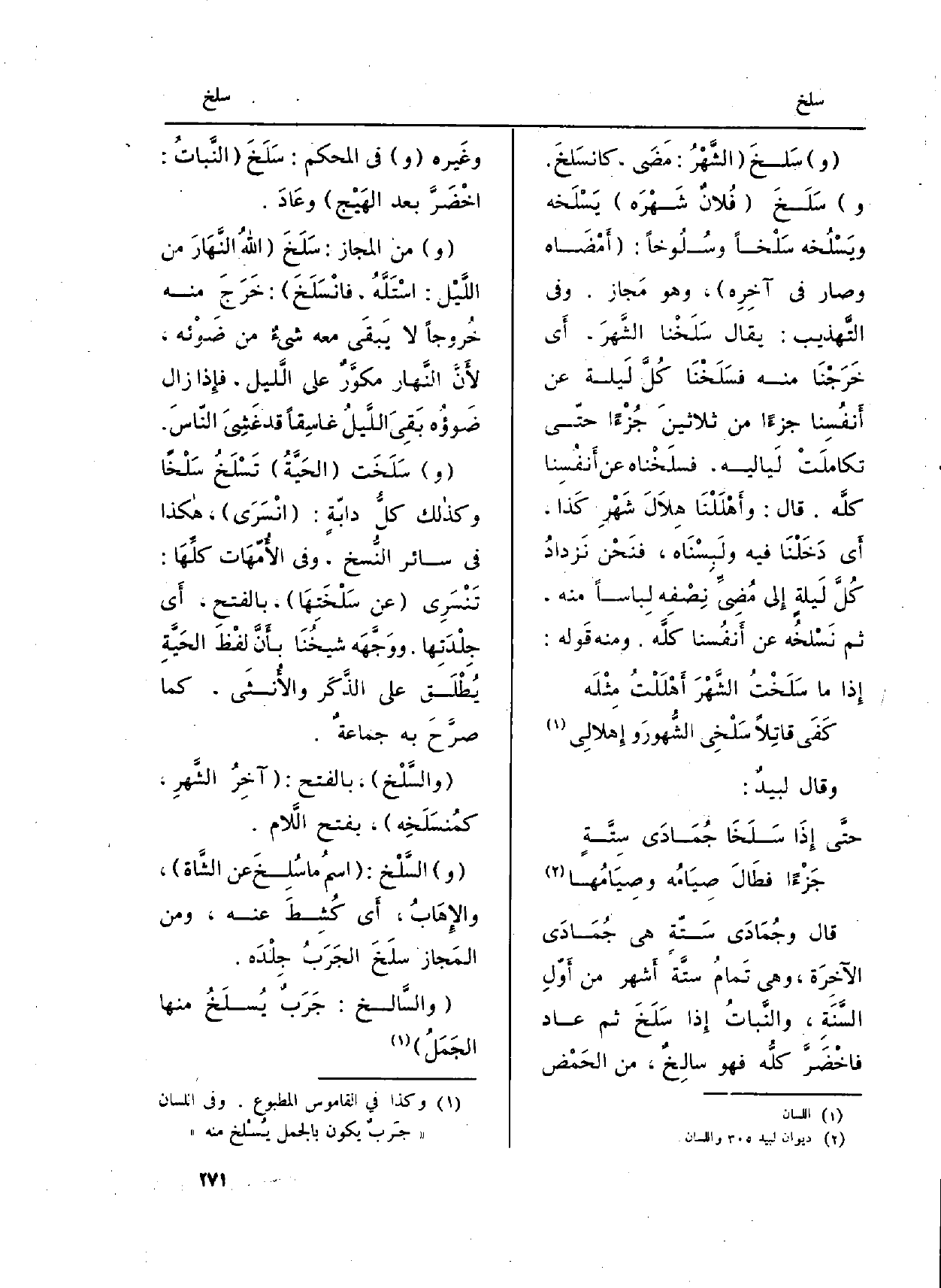 (و) سَلخَ (الشَّهْرُ: مَضَى، كانسَلخَ. و) سَلَخَ (فُلاَنٌ شَهْرَه) يَسْلَخه ويَسْلُخه سَلْحاً وسُلُوخاً: (أَمْضَاه وَصَارَ فِي آخِرِه) ، وَهُوَ مَجاز. وَفِي (التَّهْذِيب) : يُقَال سَلَخْنَا الشَّهرَ، أَي خَرَجْنَا مِنْهُ فسَلَخْنَا كُلَّ لَيلة عَن أَنفُسِنا جُزْءا من ثلاثينَ جُزْءًا حتّى تكاملَتْ لَياليه، فسلَخْنَاه عَن أَنفُسِنا كلَّه. قَالَ: وأَهْلَلْنَا هلاَلَ شَهْرِ كَذا، أَي دَخَلْنَا فِيهِ ولَبِسْنَاه، فنَحْن نَزدادُ كُلَّ لَيلةً إِلى مُضِيِّ نِصْفِه لِباساً مِنْهُ، ثمَّ نَسْلخُه عَن أَنفُسنا كلَّه. وَمِنْه قَوله: