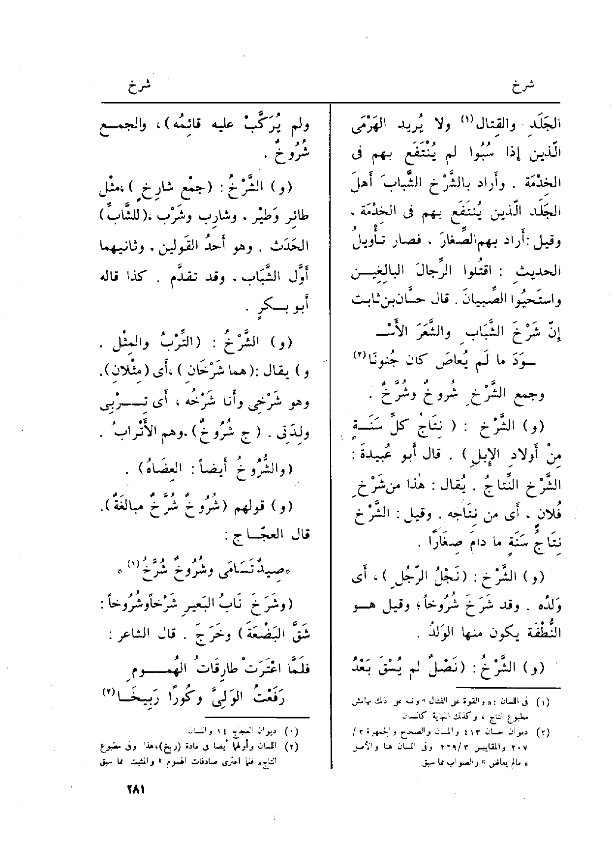 الجَلَدِ والقِتال وَلَا يُريد الهَرْمَى الّذين إِذا سُبخوا لم يُنْتَفَع بهم فِي الخِدْمَة. وأَراد بالشَّرّخ الشَّبابَ أَهلَ الجَلَد الّذين يُنتَفَع بهم فِي الخِدْمَة، وَقيل: أَراد بهم الصِّغارَ، فَصَارَ تأْويلُ الحديثِ: اقتُلوا الرِّجالَ البالِغَين واستَحيُوا الصِّبيانَ. قَالَ حسَّان بن ثَابت: