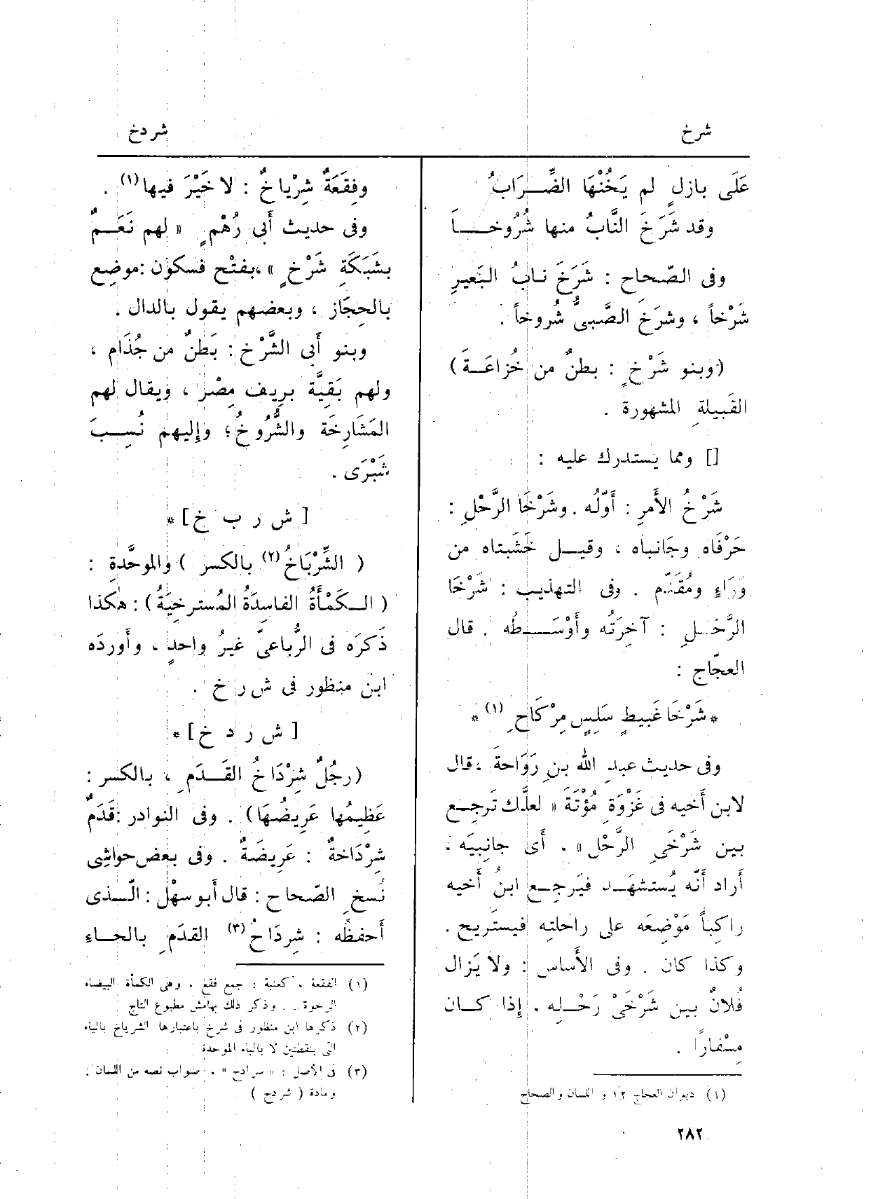 : (رَجُلٌ شِرْدَاخُ القَدَمِ، بِالْكَسْرِ: عَظِيمُهَا عَرِيضُهَا) . وَفِي (النَّوَادِر) : قَدَمٌ شِرْدَاخةٌ: عَرِيضَةٌ. وَفِي بعض حواشِي نُسخِ (الصّحاح) : قَالَ أَبو سهْل: الّذي أَحفظُه: شِردَاحُ القدَمِ بالحاءِ