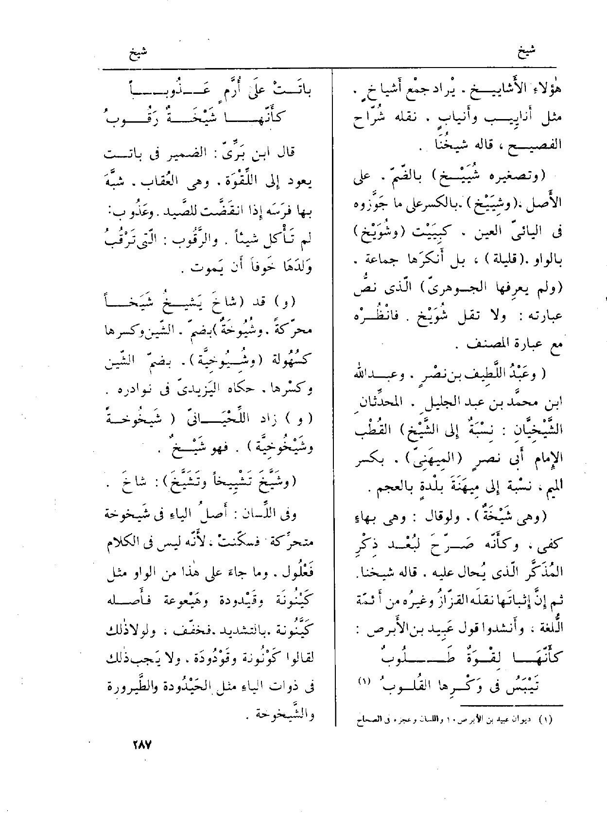 (وَهِي} شَيْخَةٌ) ، وَلَو قَالَ: وَهِي بهاءٍ كفى، وكأَنّه صَرّحَ لبُعْد ذِكْرِ المُذَكَّر الّذي يُحال عَلَيْهِ، قَالَه شَيخنَا. ثمَّ إِنَّ إِثباتَها نقلَه القزّازُ وغيرُه من أَئمّة اللُّغة، وأَنشدوا قَول عَبِيد بن الأَبرص: