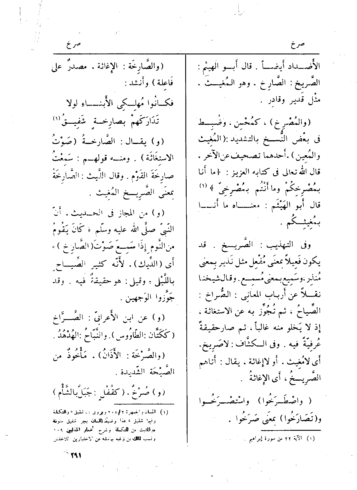 (والمُصْرِخ) ، كمُحْسِن، وضُبِط فِي بعْض النُّسخ بِالتَّشْدِيدِ: (المُغِيث والمُعِين) ، أَحدهما تَصْحِيف عَن الآخر، قَالَ الله تَعَالَى فِي كِتَابه الْعَزِيز: {7. 016 مَا اءَنا بمصرخكم. . بمصرخي} (إِبراهيم: 22) قَالَ أَبو الهَيْثَم: مَعْنَاهُ مَا أَنا بمُغَيثِكُم.