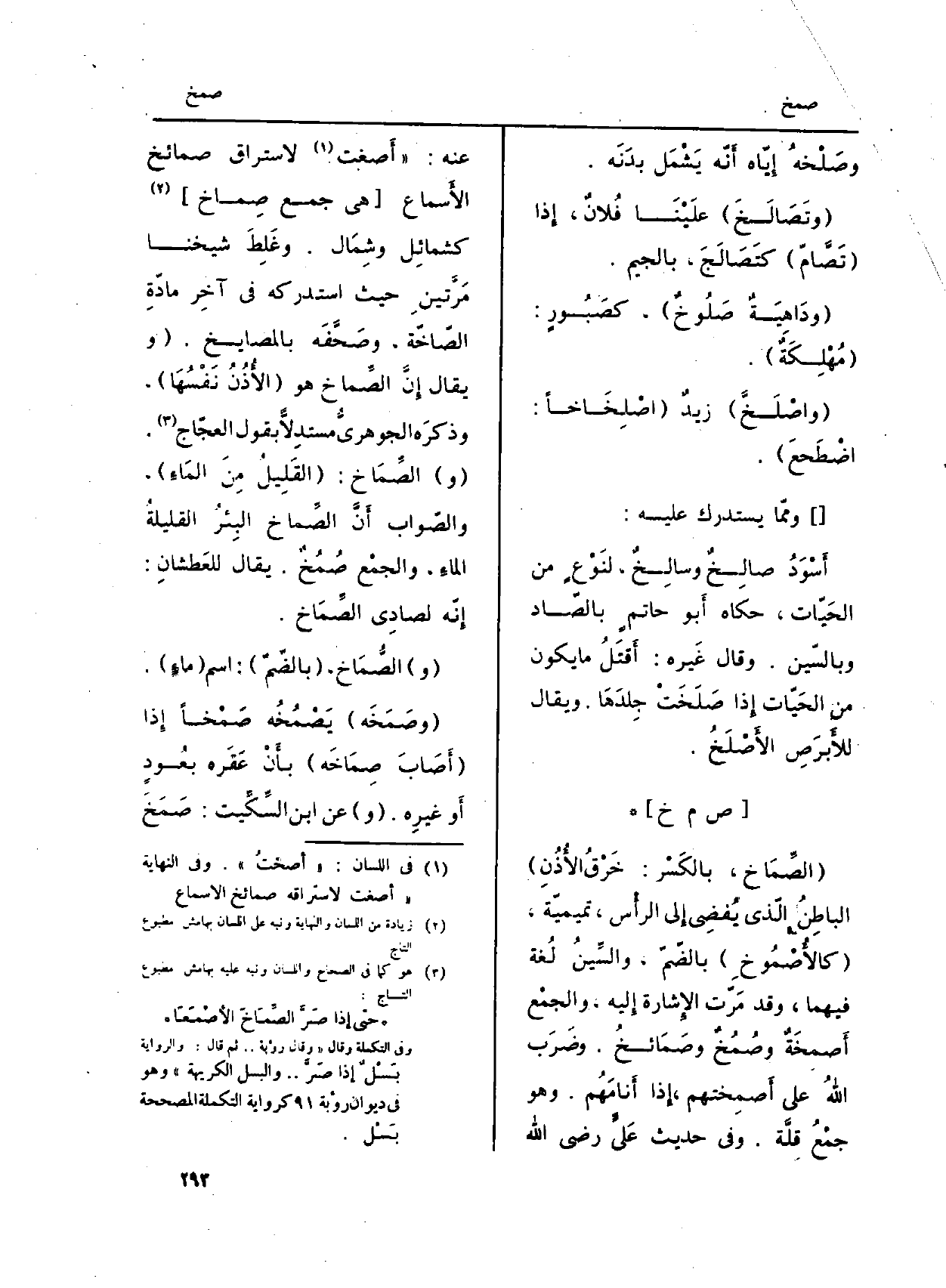 : (الصِّمَاخ، بالكَسْر: خَرْقُ الأُذُنِ) الباطِنُ الّذي يُفضِي إِلى الرأْس، تميميّة، (كاللأُصْمُخِ) بالضّمّ، والسِّينُ لُغة فيهمَا، وَقد مَرّت الإِشارة إِليه، والجمْع أَصمِخَةٌ وصُمُخٌ وصَمَائخُ. وضَرَب اللَّهُ على أَصمِختهم، إِذا أَنامَهُم. وَهُوَ جمْعُ قِلَّة. وَفِي حَدِيث عَليَ رَضِي الله عَنهُ: (أَصغت لاستراق صمائخ الأَسماع (هِيَ جمع صِماخ) كشمائِل وشِمَال. وغَلَطَ شَيخنَا مَرَّتينِ حَيْثُ استدركه فِي آخِر مادّةِ الصَّاخّة، وصَحَّفَه بالمصايخ. (و) يُقَال إِنَّ الصِّماخ هُوَ (الأُذُنُ نَفْسُهَا) ، وذكرَه الجوهريُّ مستدِلاًّ بقول العجّاج. (و) الصِّمَاخ: (القَلِيلُ مِنَ المَاءِ) ، والصّواب أَنَّ الصِّماخ البِئرُ القليلةُ الماءِ، والجمْع صُمُخٌ. يُقَال للعَطشانِ: إِنّه لصادِي الصِّمَاخ.
