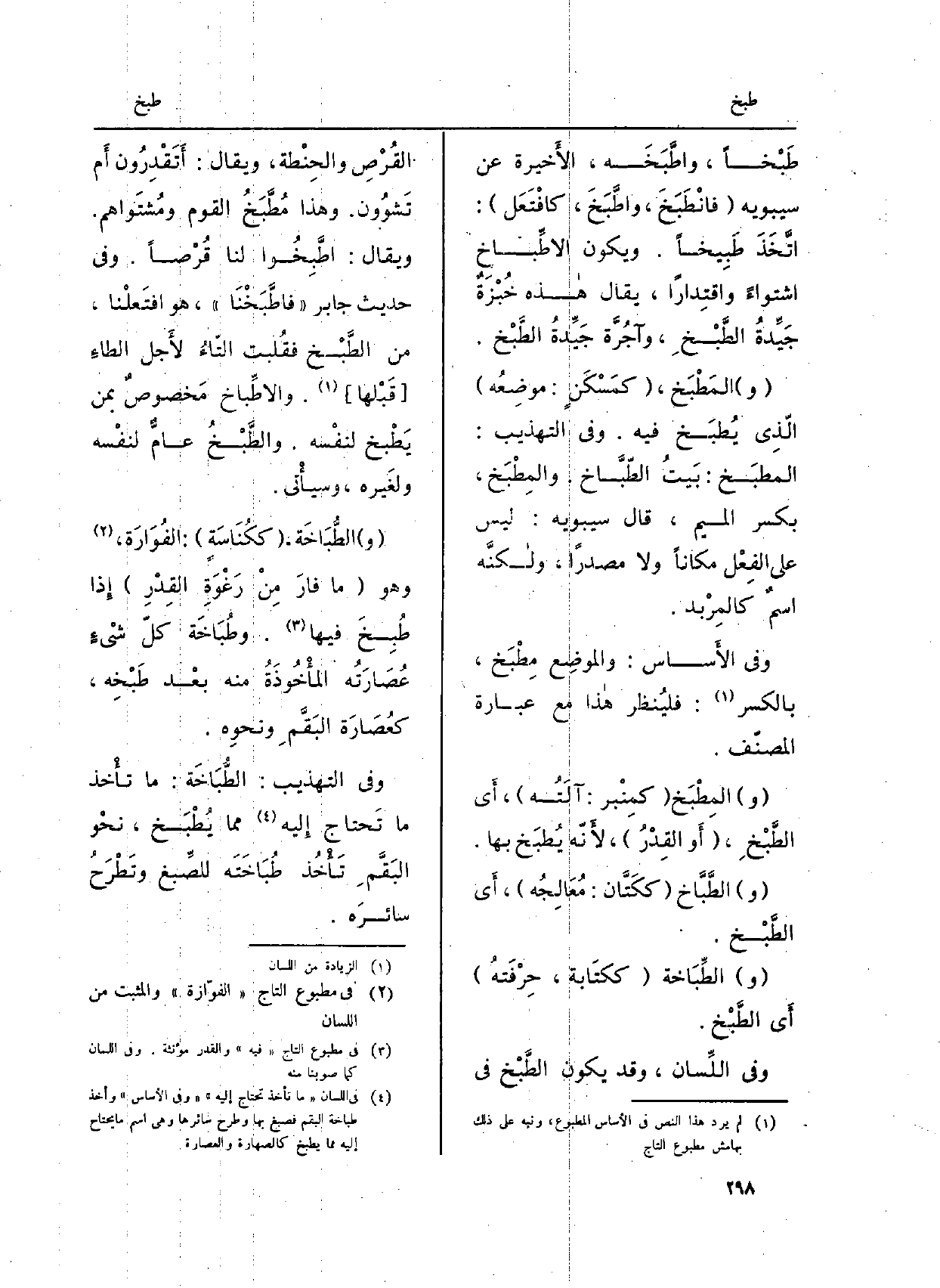 وَفِي (اللِّسان) ، وَقد يكون الطَّبْخ فِي القُرْصِ والحِنْطة، وَيُقَال: أَتَقْدِرُونَ أَم تَشوُون. وَهَذَا مُطَّبَخُ الْقَوْم ومُشتَواهم. وَيُقَال: اطَّبِخِوا لنا قُرْصاً. وَفِي حَدِيث جَابر (فاطَّبَخْنَا) ، هُوَ افتَعلْنا، من الطَّبْخ فقُلبت التّاءُ لأَجل الطاءِ (قَبْلها) . والاطِّباخ مَخصوصٌ بِمن يَطْبخ لنفْس. والطَّبْخُ عامٌّ لنفْسه ولغَيره، وسيأْتي.